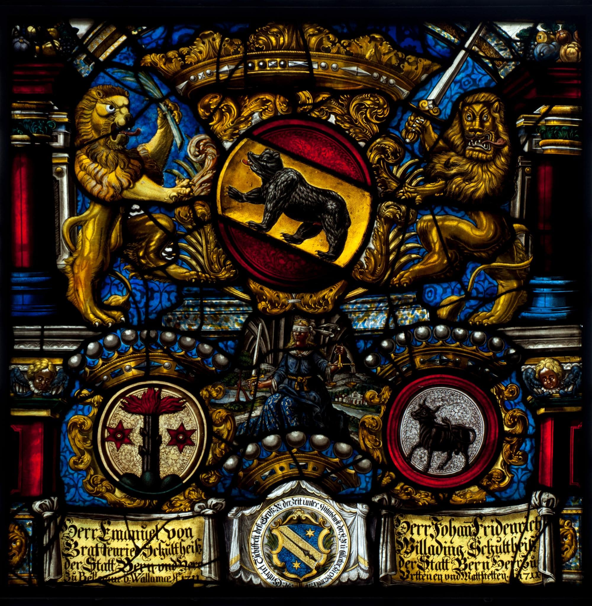 Hasler, R., & Keller, S. (2016). Standes- und Spitalscheibe Bern mit Wappen Emanuel von Graffenried, Gabriel Tschiffeli und Johann Friedrich Willading. Dans Vitrosearch. Consulté le 5 décembre 2025 de https://www.vitrosearch.ch/objects/2466703.