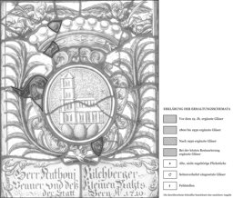 Nach Franz Thormann und Wolfgang Friedrich von Mülinen befand sich die Scheibe von Dübelbeiss 1896 im "3. Fenster" des Chors, das heisst im Fenster sII. Bei der Kirchenrenovation von 1929/30 wurden die alten Glasgemälde im Chor umplatziert (Kocher 1942). Dasjenige von Dübelbeiss verblieb dabei im Fenster sII.