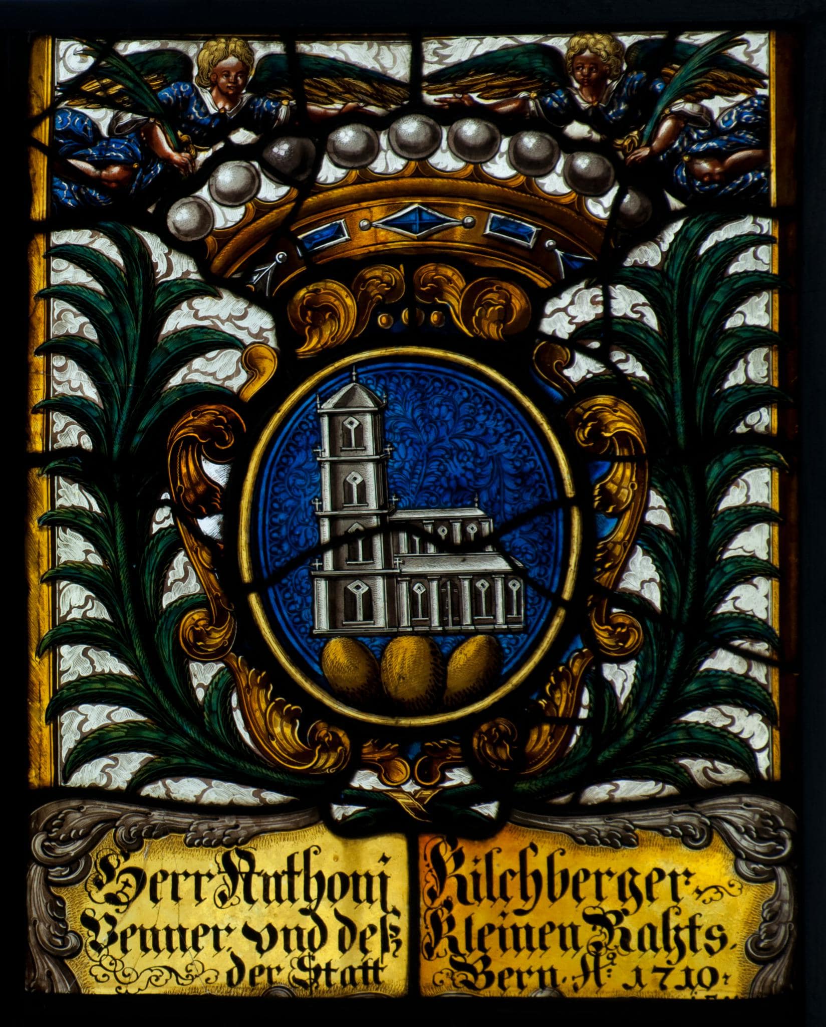 Berns Obrigkeit verehrte der fertig renovierten Kirche gleich mehrere Wappenscheiben. Unter den dort heute vorhandenen alten Glasgemälden zählen dazu die drei 1710 datierten des Deutschseckelmeisters Alexander von Wattenwyl und der Venner Johann Jakob Dübelbeiss und Johann Anton Kirchberger sowie die Bernscheibe von 1711. Im Laufe der zweiten Hälfte des 17. Jahrhunderts war die Berner Regierung dazu übergegangen, ihre erneuerten Landkirchen jeweils mit einer ganzen Glasgemäldeserie zu beschenken. Dazu gehörten normalerweise sechs Scheiben, nämlich diejenigen mit den Wappen Berns, des Deutschseckelmeisters und der vier Venner (Thormann/von Mülinen 1896, S. 47f.). Dieser Schenkungsmodus kam vermutlich auch im Falle der Kirche Oberwils zur Anwendung. Man darf deshalb davon ausgehen, dass Bern 1710 noch zwei weitere, heute verschollene Vennerscheiben dorthin vergabte.