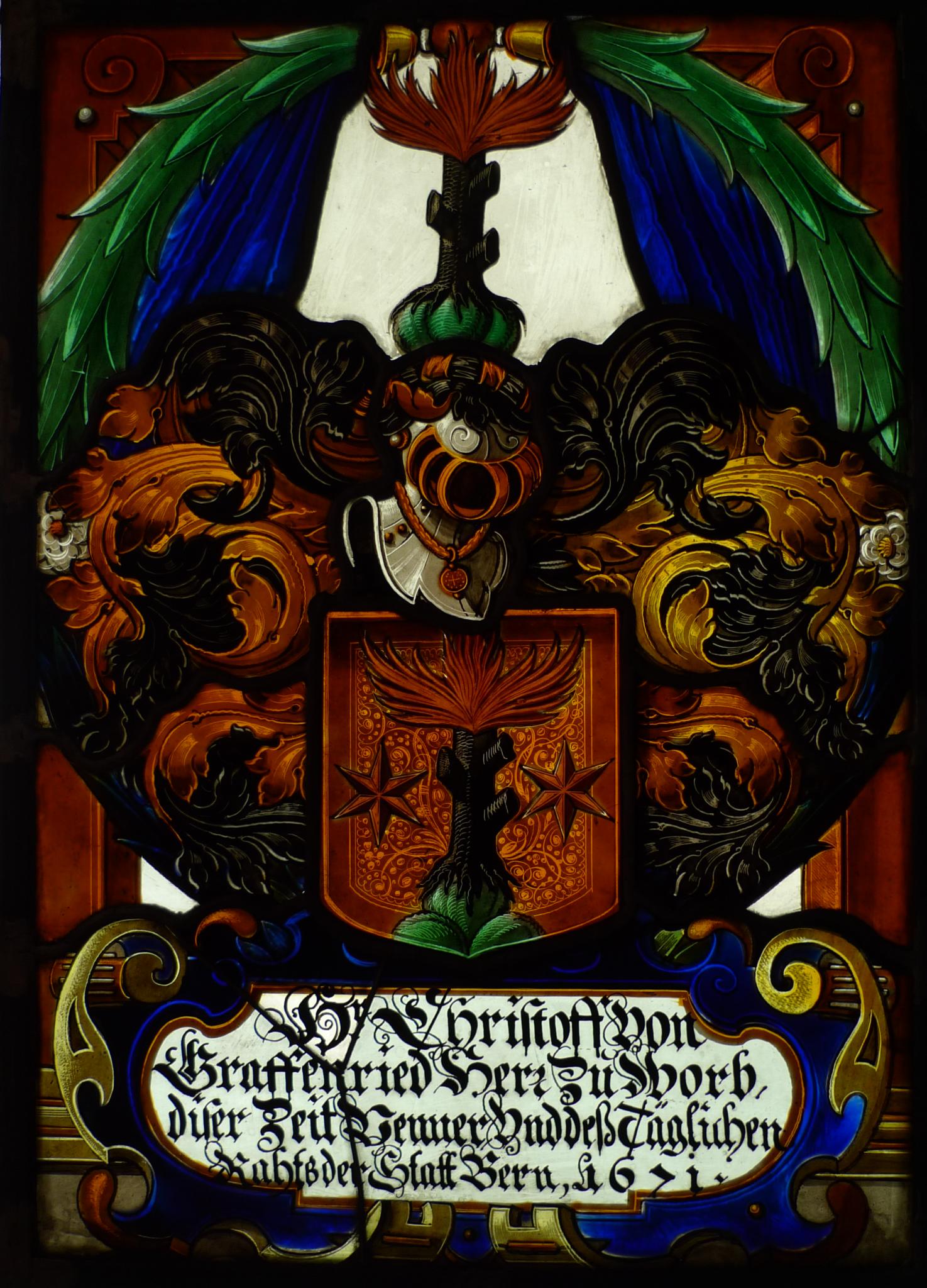 Christoph von Graffenried (1603–1687), der Sohn Abrahams (1580–1620), trat nach Studien in Lausanne, Genf, Dijon und Paris in die Leibgarde des Prinzen Friedrich Heinrich von Oranien ein.Zurück in Bern wurde er hier 1635 Mitglied des Grossen und 1651 des Kleinen Rats. 1642–1648 amtete er als Landvogt von Nidau. 1654 war er Bauherr und 1657–1685 viermal Venner zu Pfistern. Daneben durchlief er eine militärische Karriere, unter anderem 1655 als Kriegsrat, 1659 als Kommandant der Waadt sowie 1683 als Oberkommandant der deutschen Lande. Er war dreimal verheiratet, seit 1631 mit Anna von Mülinen, der Tochter Josuas und Witwe des Sulpitius Tscharner, seit 1648 mit Barbara Augsburger, der Tochter des Johann Ludwig und Witwe des Samuel Zehender sowie seit 1659 mit Margaretha Tscharner, der Tochter Samuels und Witwe des Johann Georg von Werdt (HLS 5/2006, S. 588; HBLS 3/1926, S. 629).
