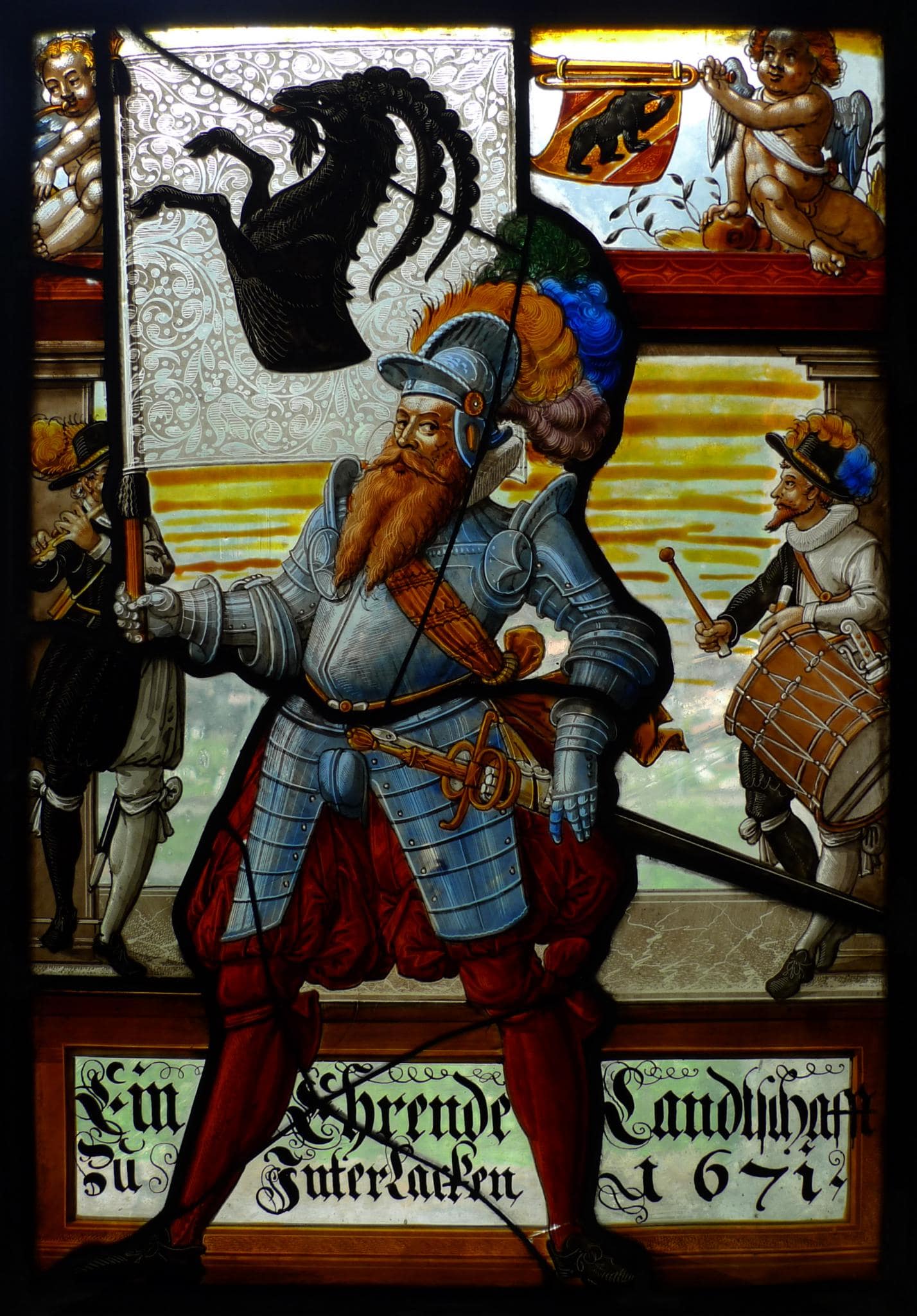 Der Bannerträger Interlakens ist breitbeinig vor dem die Stifterinschrift enthaltenden Podium postiert. Er ist in einen Halbharnisch, rote Pluderhosen und Strümpfe gekleidet und mit einen federgeschmückten Helm, Schwert und einer um die Brust gebundenen rostbraunen Schärpe ausgestattet. Begleitet wird er von zwei vor schimmernd gelbem Himmel auf dem Podium stehenden Musikanten, einem Trommler und Pfeifer. Hinter diesen erheben sich die ein rotes Gebälk tragenden Rahmenpfeiler. Auf dem Gebälk haben sich zwei Putten niedergelassen, wovon der eine in seiner Hand ein mit einer Berner Flagge geschmücktes Blasinstrument hält. Das Glasgemälde ist analog komponiert wie die Landschaftsscheibe Haslis und die Stadtscheibe Unterseens.
