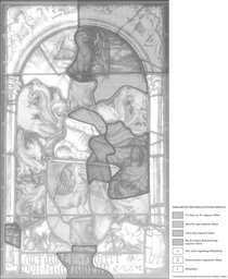 Der rechte Bogenteil und ein Teil der Helmdecke alt ergänzt; ein Teil des Himmels und der Helmzier sowie je ein Stück des Wappens, des Helmes, der Helmdecke, der Säulenbasen unten links, der Inschrift und des Rasens neu ergänzt; die Schwarzlotbemalung stellenweise beschädigt; Sprünge und Sprungbleie; die Verbleiung erneuert.