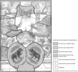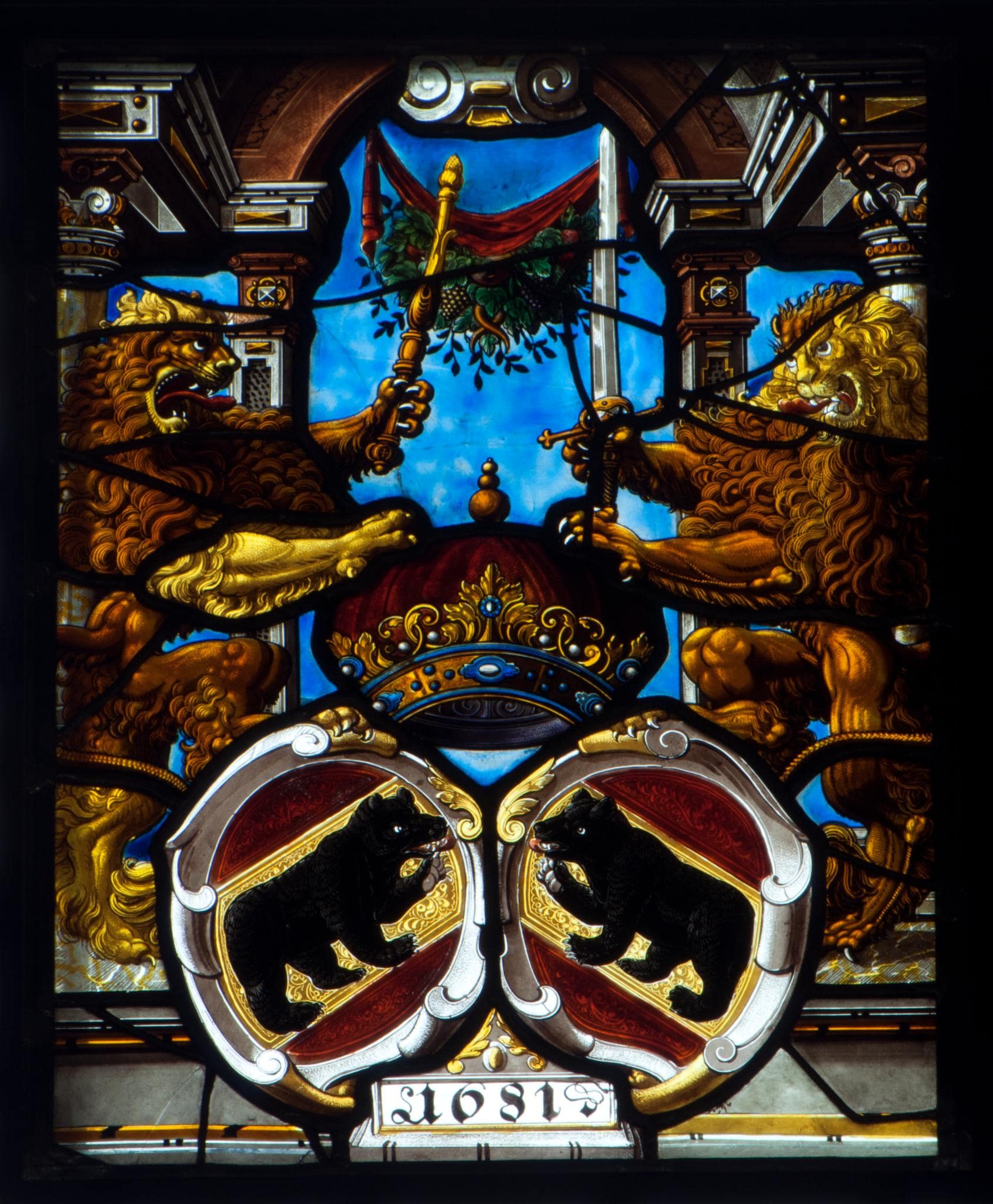 Das ergänzte Schildpaar mit dem Berner Wappen ruht in ovalen Kartuschen auf dem Podiumsvorsprung mit dem Stiftungsjahr. Als Schildwächter dienen zwei auf dem Podium stehende Löwen mit Zepter bzw. Schwert in den Vorderpranken. Sie halten über den Schilden gemeinsam die Krone empor. Dahinter erhebt sich vor blauem Grund eine mehrfarbige dreiachsige Rahmenarchitektur. Ihre zentrale Öffnung bekrönt ein brauner Rundbogen, von dem an einem roten Tuch ein Fruchtbouquet herabhängt. Der Bogen fusst auf dem perspektivisch verkürzten Gebälk, das aussen von Säulen und innen von Pfeilern gestützt wird.