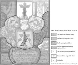 Zahlreiche Gläser neu ergänzt (Schrifttafel mit beiden anschliessenden Eckstücken, Stück der Helmdecke, mehrere Palmwedelteile, Glas in Ecke oben links, Stück im Wappen); drei alte Flickstücke in der oberen rechten Ecke; Sprünge und Sprungbleie; die Verbleiung erneuert.