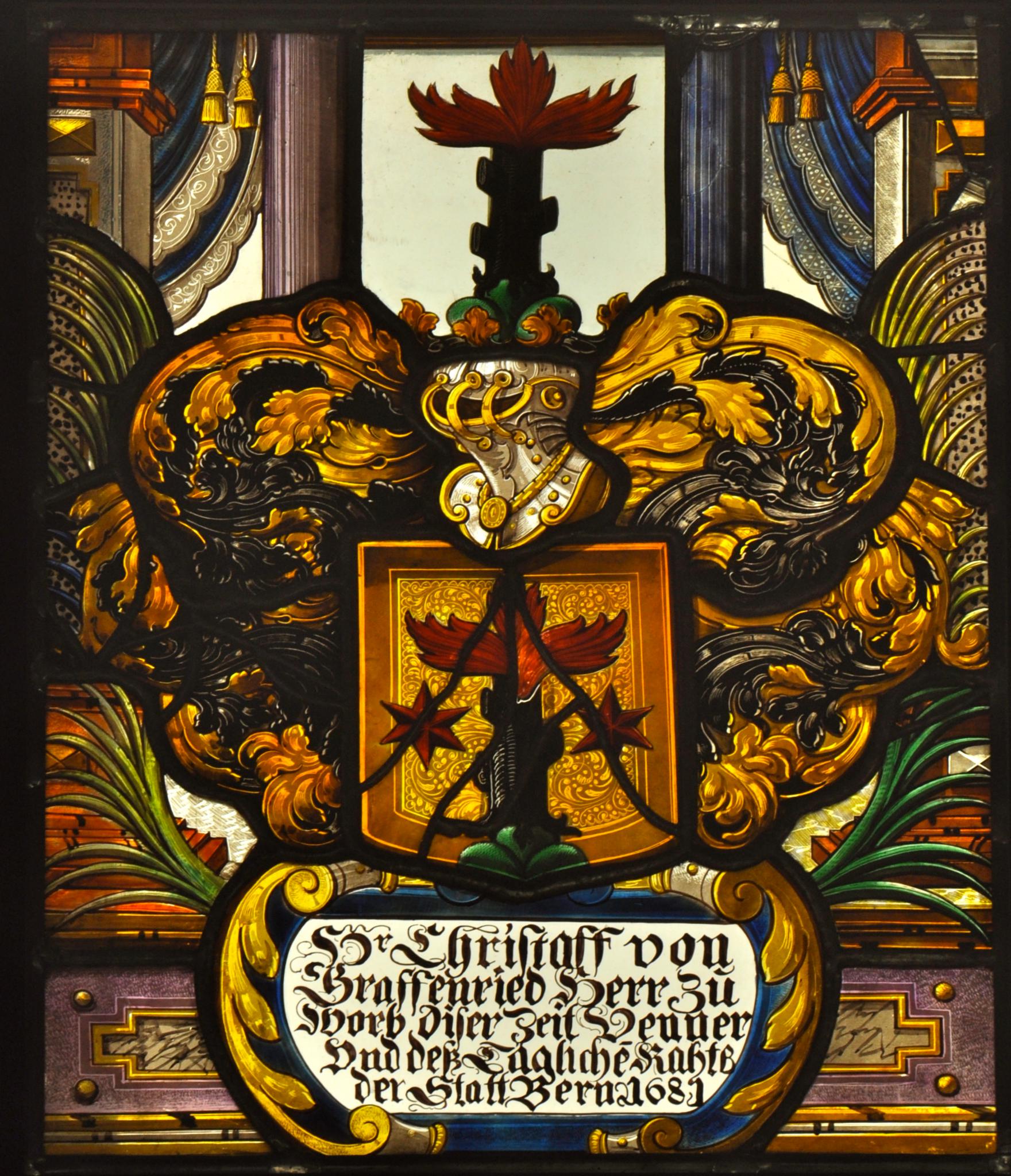 Hasler, R., Keller, S., & Bergmann, U. (2016). Wappenscheibe Christoph von Graffenried. Dans Vitrosearch. Consulté le 5 décembre 2025 de https://www.vitrosearch.ch/objects/2467160.