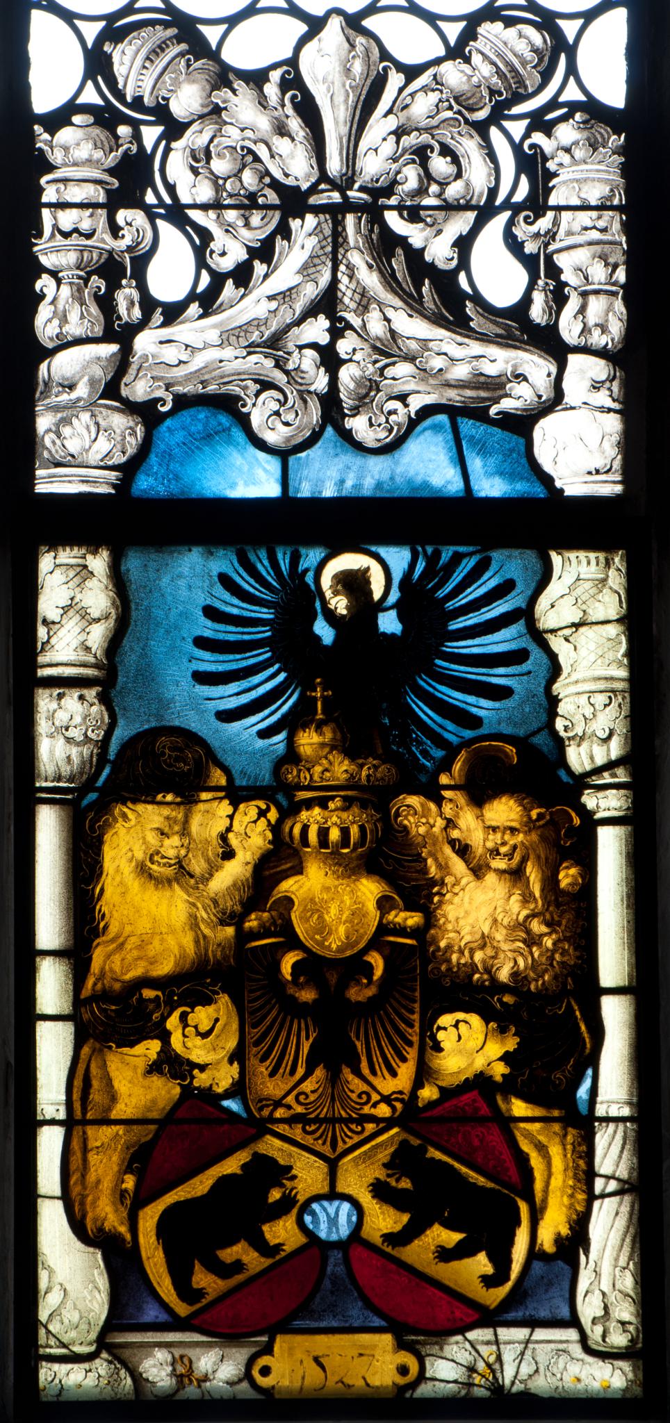 Vor blauem Grund steht die Wappenpyramide Bern-Reich. Sie wird von zwei auf einer violetten Bodenplatte postierten Löwen begleitet. Auf dem bekrönten goldenen Helm über dem Reichswappen sitzt der Reichsadler mit dem Reichsapfel in den Klauen. Das Stiftungsjahr 1522 befindet sich auf der gelben Tafel im Zentrum des ornamentierten Sockels am Scheibenfuss. Als seitliche Rahmung dienen zwei schlanke steinfarbene Säulen, deren Basen und Kapitelle mit Blattwerk geschmückt sind. Der die Scheibe bekrönende, opulente Renaissance-Giebel im oberen Fensterfeld ist eine moderne Kopie.