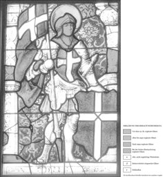 Die Renaissance-Bekrönung im oberen Feld ist eine neuzeitlicher Kopie. In der Figurenscheibe der Heiligenkopf mit Hals und Helm, das untere Ende der Fahnenstange sowie Stücke in der Rahmung neu ergänzt (das Foto 6562 des SNM Zürich zeigt an Stelle des von Drenckhahn neu eingesetzten Kopfes noch denjenigen Röttingers oder Müllers); die Gläser stellenweise leicht korrodiert; Sprungbleie; die Verbleiung erneuert.