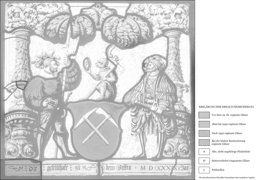 Das Wappen der Berner Zunft zum Affen mit dem gekreuzten Zweispitz und Steinhauerhammer befindet sich vor grau-weissem Damastgrund auf dem schmalen, mit dem Stifternamen beschrifteten Podium. Es handelt sich um das alte Wappen der Gesellschaft, in der alle steinverarbeitenden Berufe, aber auch Hafner, Drechsler, Goldschmiede, Bildhauer und Künstler vereint waren. Das heutige Zunftwappen zeigt einen aufgerichteten Affen, der sich einen Spiegel vor das Gesicht hält und einen Spitzhammer geschultert hat. In sitzender Haltung ist hier dieser Affe als Zunftsymbol auf dem Wappenschild dargestellt. Als Schildwächter fungieren zwei auf dem Podium stehende bärtige Männer in Federhüten. Der eine erscheint als Halbartier mit Schwert und Schweizerdolch in grünen Beinkleidern und rotem, bauschigem Hemd, der andere als Schwertträger in reicher schwarz und gelb gestreifter Gewandung. Figuren und Wappen rahmen seitlich auf mächtigen violetten Basen ruhende gelbe Säulen mit prachtvollem Blattschmuck. Darüber spannt sich in geschwungener Form buntes, voluminös gebildetes Blattwerk.
