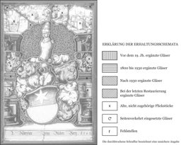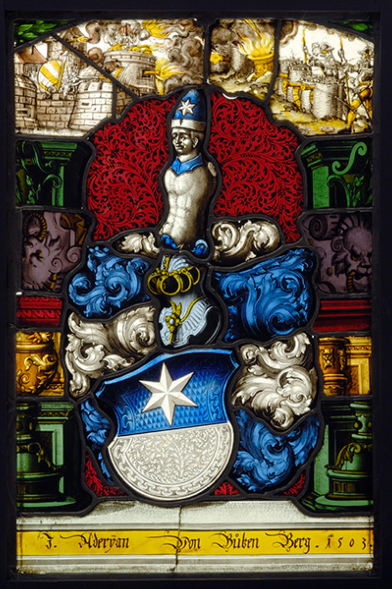 Nach Alfred Scheidegger (1947, S. 43) soll das "Oberbild" ein Originalteil der Scheibe sein und im Sinne des Stifters, dessen Vater Adrian II. Murten verteidigte, die Belagerung Murtens darstellen. Es handelt sich dabei aber um ein Flickstück. Zwei eng verwandte Scheiben lassen die ursprüngliche Komposition erahnen. Es sind die beiden 1563 datierten Wappenscheiben des Ulrich von Englisberg im Schloss Greyerz (31,8 x 21,5 cm; vgl. Kurmann-Schwarz 1998, S. 481; Bergmann 2014, Bd. 2, Kat.-Nr. 49) und des Hans Anton Tillier im Bernischen Historischen Museum (BHM Bern, Inv. 58505). Sie zeigen beide einen Renaissancebogen. Diese zwei Werke und die vorliegende Bubenberg-Scheibe stammen aus der gleichen, unbekannten Werkstatt. Vielleicht wurden sie 1563 sogar an den gleichen Ort gestiftet. Gut vergleichbar sind gleichfalls die 1563 datierten Scheiben des Samuel von Mülinen (BHM Bern, Inv. 26168), Burkhart von Erlach (verschollen; 32 x 22 cm; vgl. Scheidegger 1947, Abb. 42), Heinrich Grebel (Schloss Wildegg; 32 x 21,5 cm; Scheidegger 1947, Abb. 36) und der Ursula Falk (verschollen; Bergmann 2014, Bd. 2, Abb. 238.1).