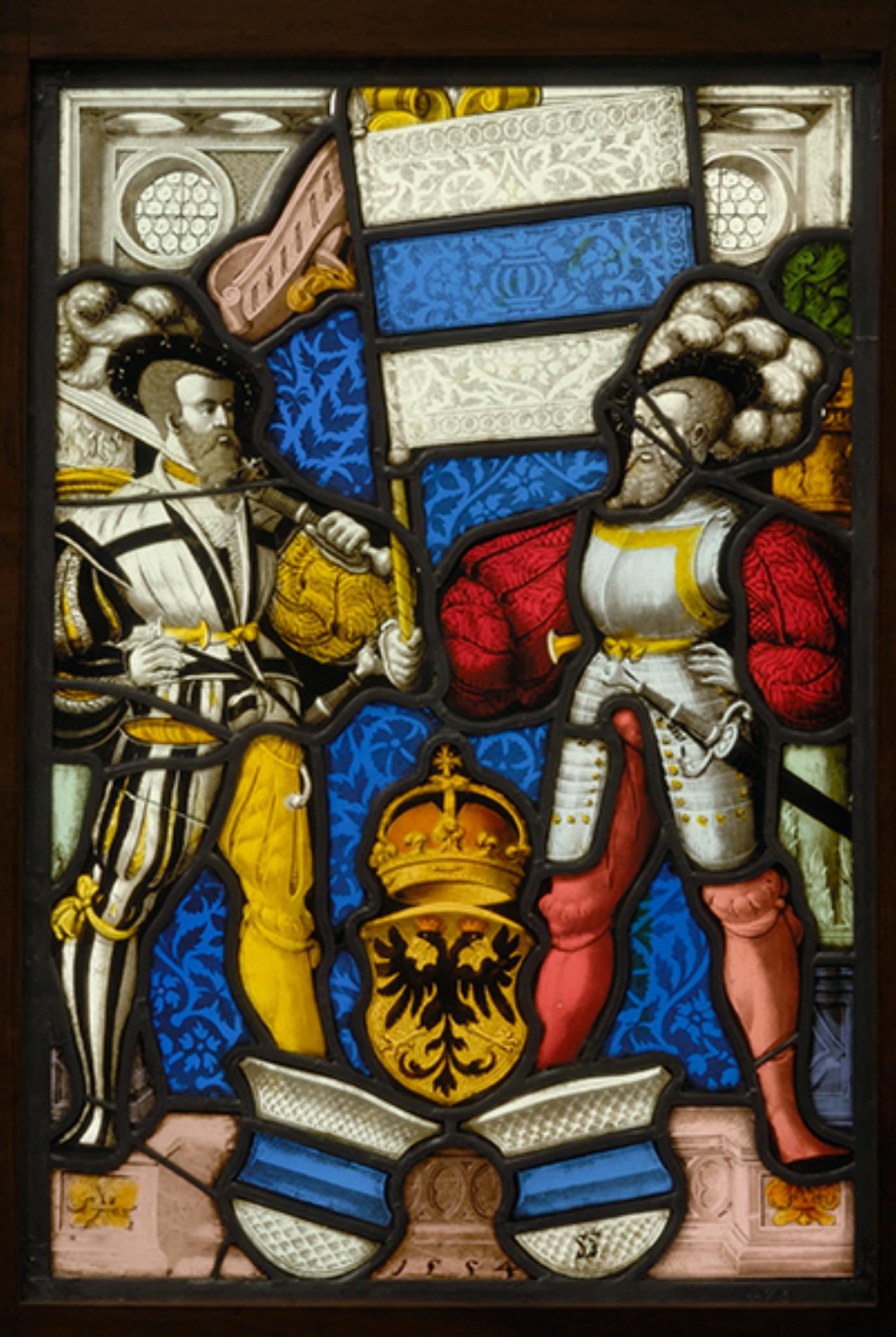 Die bekrönte Wappenpyramide Zug-Reich ist vor das hellrosa Podium am Scheibenfuss gesetzt. Zwischen den beiden Zuger Schilden ist an diesem das Stiftungsjahr festgehalten. Das Podium dient gleichzeitig als Standfläche für die beiden vor blauem Nelkendamast stehenden Schildbegleiter. Bei ihnen handelt es sich um einen Krieger mit geschultertem Zweihänder und um den Zuger Bannerträger. Letzterer erscheint in rotem Hemd und rosa Hosen, einem stahlblauen Halbharnisch und einem schwarzen Federbarett. Wie sein Kollege ist er mit Schwert und Schweizerdolch bewaffnet. Dieser trägt Hemd und Hosen in den Miparti-Farben Gelb und Schwarz-Weiss gestreift. Hinter den beiden Männern erhebt sich eine Säulenrahmung mit hellrosa Volutenbogen. Die Eckfelder neben diesem Bogen füllen butzenverglaste Rundfenster.