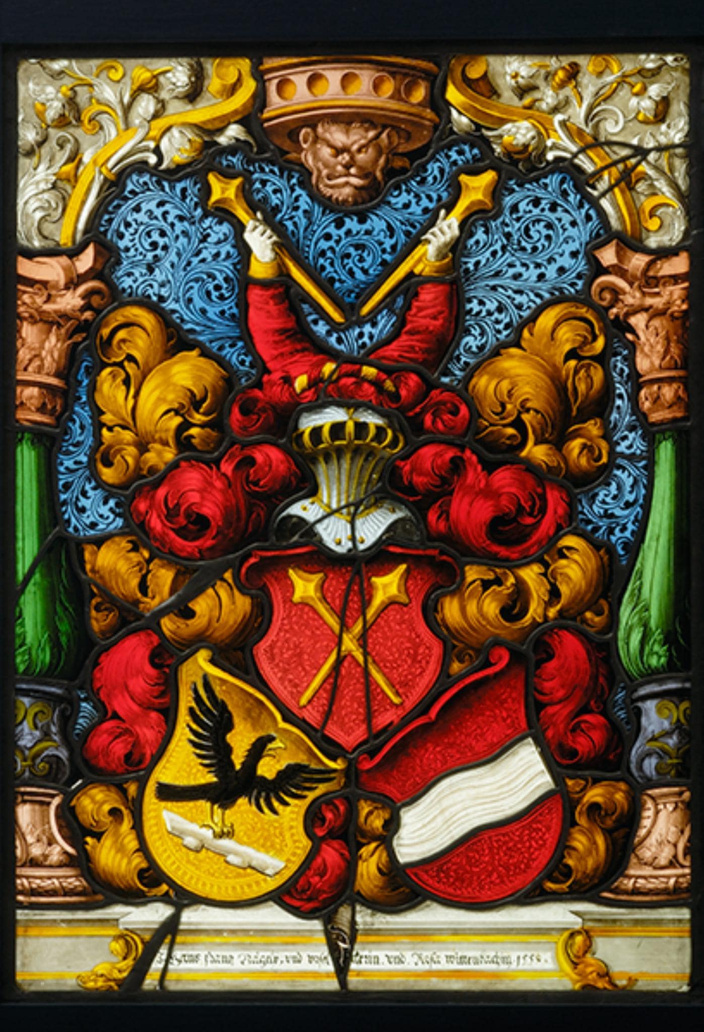 Die pyramidenförmig angeordneten Wappen Hans Franz Nägelis und dessen beiden Frauen sind vor blauem Grund mit schwarzen Spiralranken auf das Podium mit der Stifterinschrift gesetzt. Über den Kapitellen der rahmenden, mehrfarbigen Balustersäulen erhebt sich ein gelber Volutenbogen mit Blattwerk, der in einem rosa Schlussstein mit Löwenmaske endet.