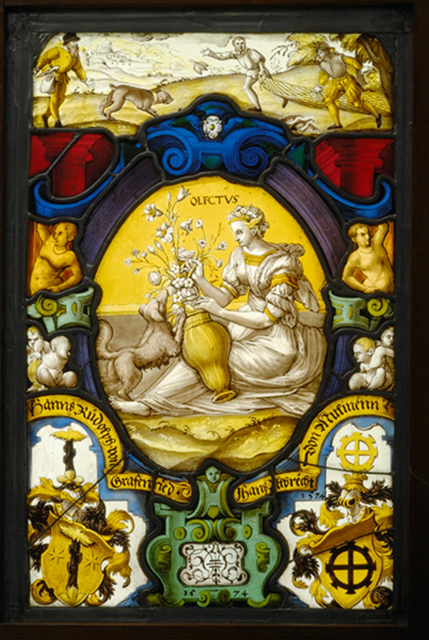 Im Hauptbild erscheint die Allegorie des Geruchssinns Olfactus in Gestalt einer weiss gekleideten, mit Blumen bekränzten Frau. Am Boden sitzend, hält diese in ihren Händen eine Vase mit Blumen, die ein Hund anspringt. Die Darstellung umgibt ein violetter Ovalrahmen mit einer blauen Rollwerkkartusche am Scheitel sowie je einer hellgrünen zu beiden Seiten und am Fuss. Die seitlich daran anschliessenden Rahmenstützen mit roten Kapitellen sind mit sitzenden Putten sowie einer weiblichen bzw. männlichen Figur besetzt. Die unteren Bildecken füllen die Vollwappen von Hans (Johann) Rudolf von Graffenried und Hans Albrecht von Mülinen. Im Oberbild sind drei Männer mit Hund und Netz bei der Rebhuhnjagd festgehalten.