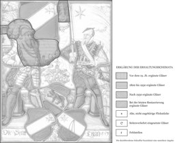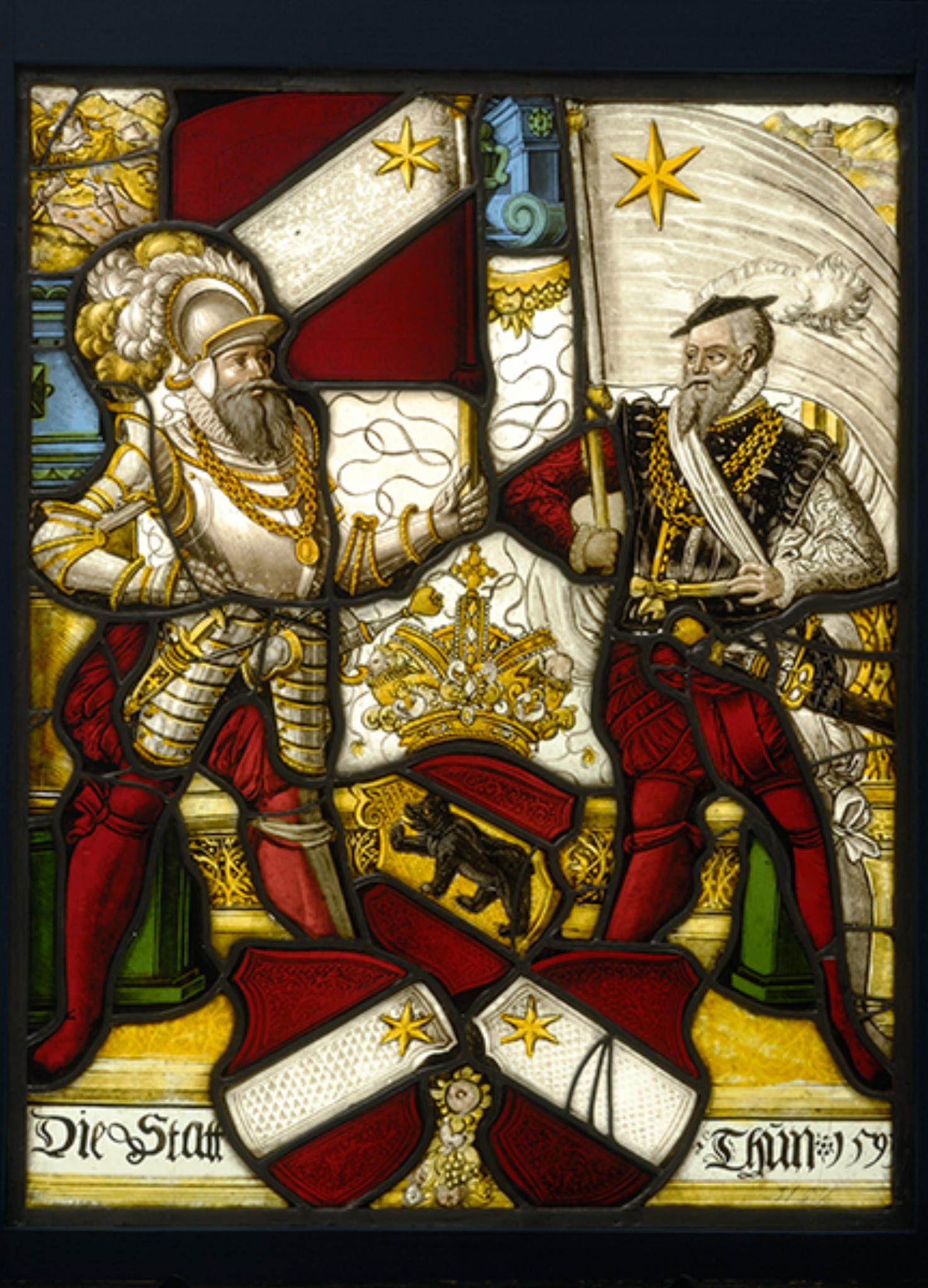 Die vor das Podium mit dem Stadtnamen gesetzten beiden Thuner Wappenschilde werden vom bekrönten Bernschild überhöht. Zwei vor schnurverziertem farblosem Grund und einer Balustrade stehende Venner begleiten die Wappenpyramide. Derjenige links mit dem Thuner Banner erscheint in roten Beinkleidern und einem Halbharnisch. Zu seiner Bewaffnung gehören Schwert und Schweizerdolch. Sein Gegenüber mit dem Thuner Auszugsbanner ist wie dieser mit Schwert und goldener Ehrenkette ausgezeichnet. Er trägt rote Hosen und Strümpfe, ein schwarzes Wams und ein Hemd in den Miparti-Farben Rot und Weiss. Hinter den Figuren erhebt sich eine Pfeilerrahmung und im Oberbild oben links ist Simsons Löwenkampf (Ri 14,5f.) dargestellt.