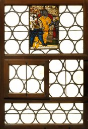 Vor gelbem, aus hellbrauner Lasur radiertem Blattdamast steht sich das Stifterpaar einander gegenüber. Der bärtige, schwertbewaffnete Mann links erscheint in blauen Hosen und Strümpfen, grauem Hemd sowie schwarzem Wams und Federhut. Er hat seine Büchse geschultert und hält in der Rechten die Gewehrgabel. Seine Frau trägt ein hellviolettes Mieder, einen langen roten Rock mit grünem Endbesatz sowie eine reich gemusterte Schürze. Sie hält ihrem Mann den Becher mit dem Willkommenstrunk entgegen. Hinter den Figuren ragt ein roter Bogen mit maskengeschmückter Scheitelkartusche in die Höhe. Im Oberbild sind zwei Bauern beim Pflügen mit einem Ochsengespann festgehalten. Zu Füssen des Stifters ist sein Wappen am beschrifteten Podium angebracht.