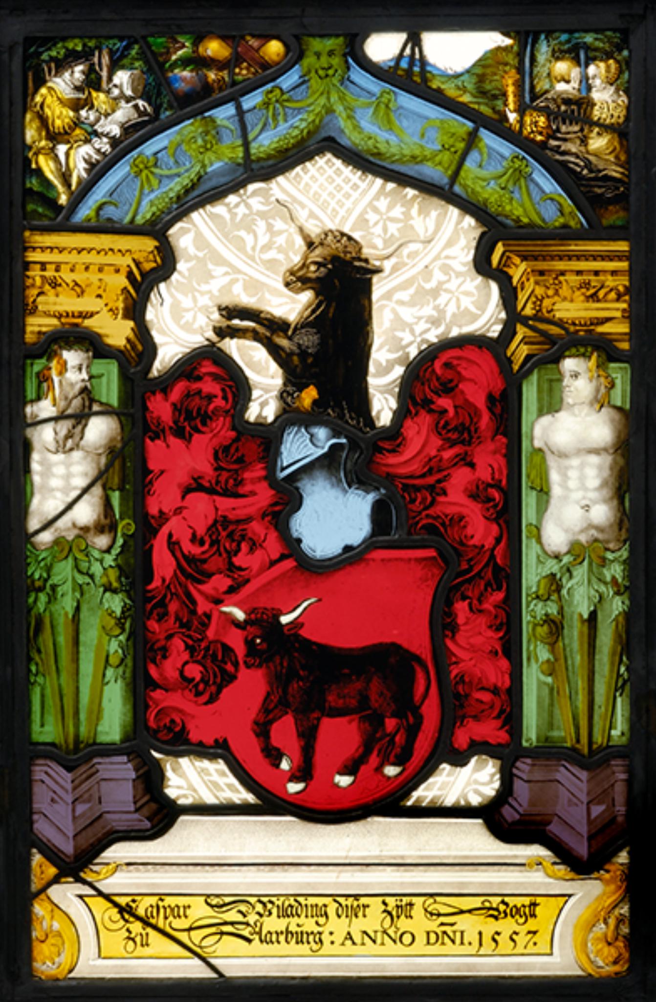 Kaspar Willading schenkte die Scheibe in seinem letzten Amtsjahr als Vogt von Aarburg an einen unbekannten Ort. Eine weitere Wappenstiftung (mit erneuerter Inschrift) ist verschollen. Sie befand sich vormals in der Sammlung Wüthrich in London (Boesch 1936, S. 47, Nr. 4). Die Galerie Stuker in Bern versteigerte 1984 eine Scheibe Kaspar Willadings von 1557 (33,5 x 23 cm), die laut Katalogbeschreibung mit derjenigen des Bernischen Historischen Museums übereinstimmt (Kat. Stuker 1984, Nr. 2265). Da das Museum Willadings Scheibe bereits 1914 in Besitz nahm, kann diese allerdings nicht mit jener von Stuker identisch sein. Bei der Letzteren dürfte es sich somit entweder um eine neuzeitliche Kopie oder aber um ein weiteres, annähernd analog gestaltetes Glasgemälde Willadings aus dem Jahre 1557 handeln.
