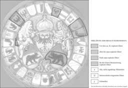 Ämterwappen (im Uhrzeigersinn oben beginnend): DVN, AROW, ZOFIGEN, BRVGK, LENZBVRG, NIDOW, BVREN, ARBERG, WANGEN, WIETLISPACH, ARBVRG, ARWANGEN, ERLACH, LANZHU(e)T, GRVENENBR..., ELLEN, HVTWIL, EMENTAL, VNDERSEWEN, INDERLABEN, ESCHY, WISENBVRG, OBERSIBENDAL, FRVTINGEN, HASLI, LOVBEN, BVRGDORF.