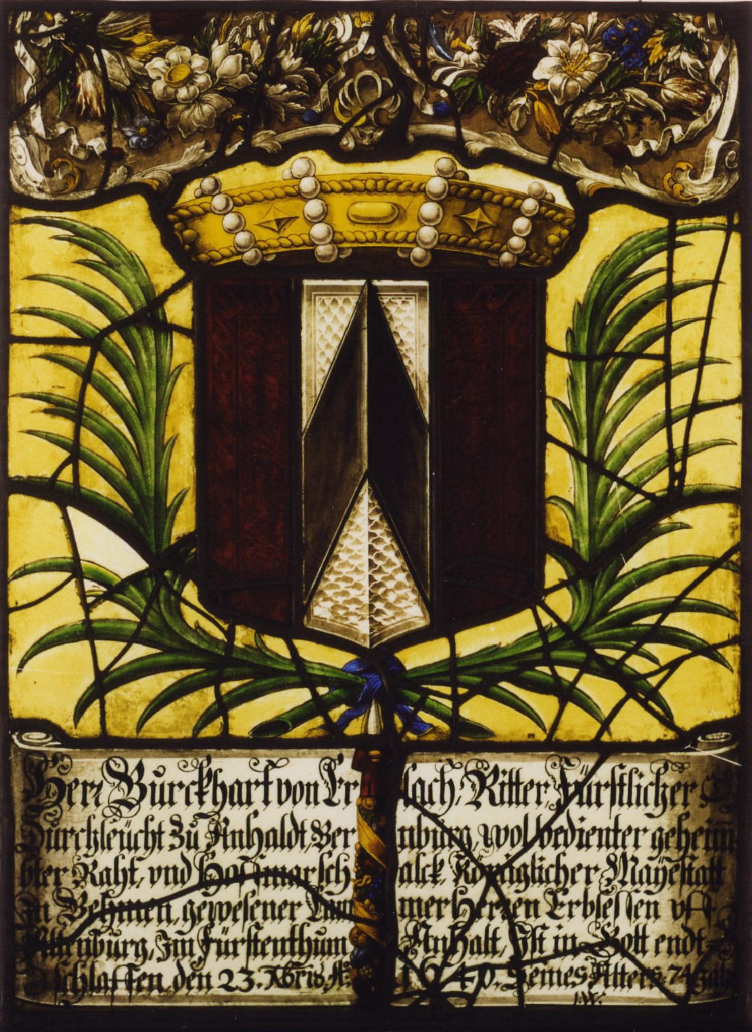 Herr Bůrckhart von Erlach Ritter Fürstlicher / Důrchleücht Zů Anhaldt Bernburg, wol bedienter geheim / bter Raht, vnd Hoffmarschalck Königlicher Maÿestatt / Jn Behmen gewesener CammerHerren Erbsessen vff / Altenbůrg Jm Fürstenthům Anhalt, Jst in Gott endt= / schlaffen den 23. dbris Ao: 1640 Seines Alters 74 Jah[r] / I.W.