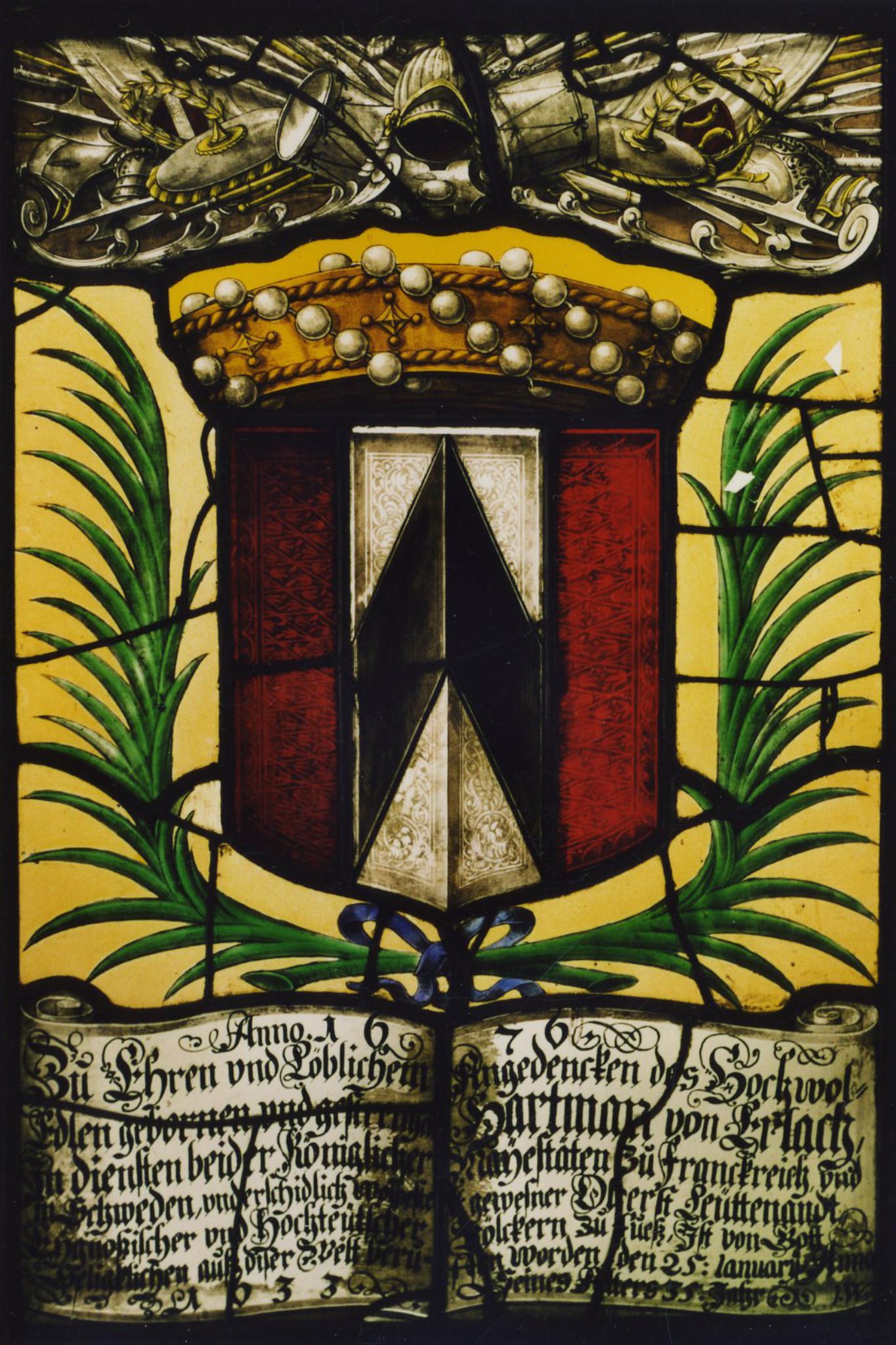 Anno 1676 / Zů Ehren vnd Löblichem Angedencken des Hochwol= / Edlen gebornen vnd gestrengen Hartman von Erlach, / Jn diensten beider Königlicher Maÿestäten zů Franckreich vnd / in Schweden, vnderschidlich wolbestelt gewesner Oberst Leüttenandt / Eÿgnoßischer vnd hochteütscher Völckern zů fůeß, Jst von Gott / Seligklichen auß diser Welt berůff[e]n worden den 25 : Ianuarÿ Anno / 1633 Seines Alters 35 Jahr I.W.
