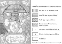 Das Vollwappen von Jakob Wyss ist vor gelbem Grund in einer ovalen violetten Rollwerkeinfassung festgehalten. Diese Einfassung ist zu beiden Seiten mit grünen Waffentrophäen (Schild, Pfeile) und darunter mit je einer phantastischen Tierfigur dekoriert. Ihr oberer Abschluss bildet eine rosa Rollwerkkartusche, neben der je ein ein Putto mit Hut niedergelassen ist. Zwei weitere Putten flankieren am Scheibenfuss das rosa Podium mit der Stifterinschrift.