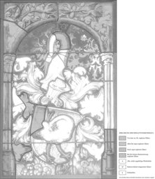 Der linke Bündelpfeiler mit dem Bogenansatz alt ergänzt; die oberen zwei Bogenteile sowie einzelne Stücke des Damasts, des Wappens, der Helmdecke, der Helmzier und des rechten Bündelpfeilers neu ergänzt; Sprungbleie; die Verbleiung erneuert.