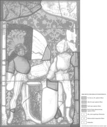 Farbloses und farbiges Glas; Bemalung mit Schwarzlot, Silbergelb und Eisenrot.