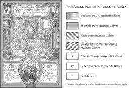 Der untere Teil des Wappens neu ergänzt und der obere Teil ein altes Flickstück (die Initialen des Wappens lauten nicht auf Christian Rufy); am linken Rand im verkehrt eingesetzten roten Pfeiler ein altes Flickstück; stellenweise Korrosionsschäden im Glas; ein Sprung und zwei Sprungbleie; die Verbleiung erneuert.