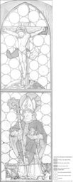 Das Kirchen- oder Kapellenfenster aus Butzenscheiben zeigt im oberen Feld den Gekreuzigten: Christus hängt im Dreinageltypus an den Balken des Kreuzes, das mit Keilen in einer Rasenscholle verankert ist und dessen senkrechter oberer Abschluss durch das INRI-Schriftband verdeckt wird. Ein Knochen weist auf das Grab Adams hin. Im unteren Fensterfeld steht ein hl. Bischof in Pontifikalkleidung auf einem Rasenboden. Seine rote, blaugefütterte Kasel bildet neben dem Silbergelb den einzigen farbigen Akzent der Darstellung. Buch und Krummstab sind dem Heiligen beigegeben, aber keine individuellen Attribute.