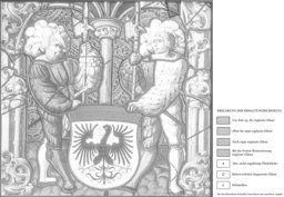 Vor blauem Hobelspandamast ist das Wappen der Stadt Aarau auf den grünen Wiesengrund gesetzt. Gehalten wird es von zwei blondgelockten Halbartieren mit weissem Federbarett sowie in weisser und stahlblauer bzw. graugrüner Miparti-Kleidung. Den Rahmen bilden zwei äussere, vor Pilaster gestellte grünlichgelbe Astsäulen mit Blattdekor sowie eine schmucklose Mittelsäule gleicher Farbe mit stahlblauem Kapitell. Aus diesem steigen fünf rotgoldene Rippen auf, die das tiefrot gehaltene Gewölbe unterteilen.