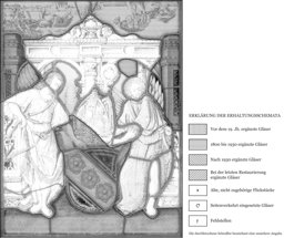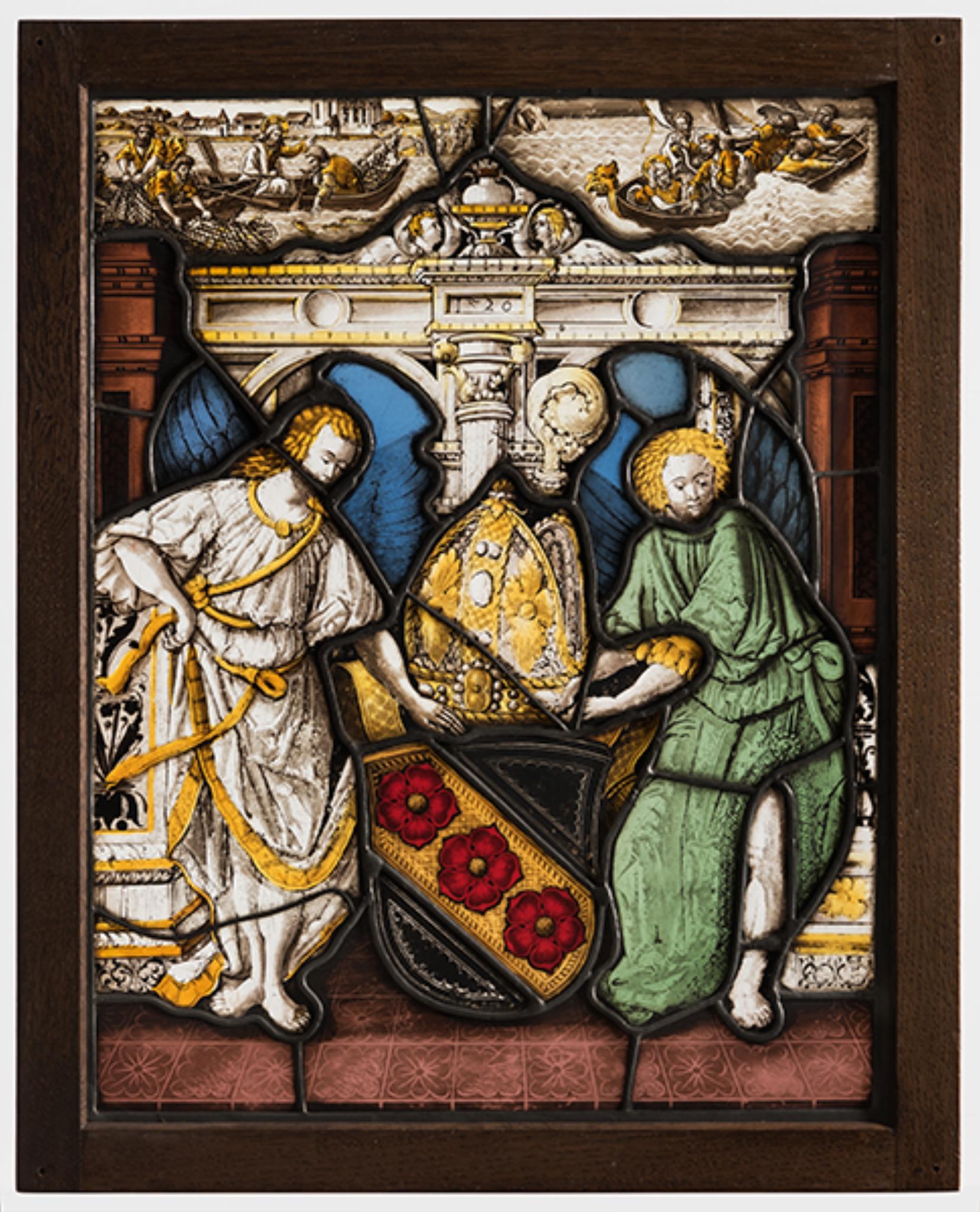Das auf lila Fliesenboden stehende Wappen des St. Johannser Abtes Rodolphe Benoît ist von dessen Insignien, der Mitra (Inful) und dem durchgesteckten Pedum, überhöht. Gehalten wird es von zwei blauflügeligen Engeln mit blonden Ringellocken, von denen der eine ein langes blassgrünes, der andere ein langes weisses Gewand mit Goldsaum trägt. Hinter Figuren und Wappen erhebt sich vor blauem Grund eine reiche Renaissancearchitektur in Form eines Doppelbogens. Dessen Stützglieder bestehen aus einem weissen Mittelpfeiler mit vorgelagerter Säule sowie zwei seitlichen Pfeilern von brauner (oben) und weisser (unten) Farbe. Darüber lagert sich ein weisser Architrav, auf dessen verkröpftem Mittelstück die Jahreszahl 1526 steht. Darauf befindet sich zwischen zwei Kopfmedaillons und Blattwerk ein bauchiges Gefäss. Das vermutlich im 19. Jahrhundert erneuerte Oberbild zeigt den Fischzug Petri und die Apostel auf dem Schiff, die in höchster Not ihren Herrn zur Besänftigung des Sturmes wecken.