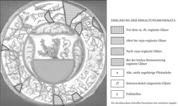 Einige neue Ergänzungen aus Klarglas; zahlreiche geklebte Sprünge und Sprungbleie; die Verbleiung erneuert. Rückseitig die Brandmarke "α".