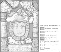 Vor rotem Federdamast ist das von der goldenen Ordenskette des hl. Michael umfasste Wappen des französischen Königs Franz I. dargestellt. Die darüber befindliche Krone wird von zwei weiss gekleideten, schwebenden Engeln gehalten, von denen der eine hellgrüne, der andere hellblaue Flügel besitzt. Ein flatterndes hellblaues Band unter dem Wappenschild enthält die Jahreszahl 1529 und darunter trägt eine einfache Tafel die den französischen Königsgesandten Louis Dangerant de Boisrigaut nennende Widmungsinschrift. Die seitliche Rahmung bilden üppig dekorierte sandfarbene Säulen auf grünen Sockeln mit feuerspeienden Drachen. Darüber erhebt sich ein sandfarbener Bogen aus reichem Blattwerk.