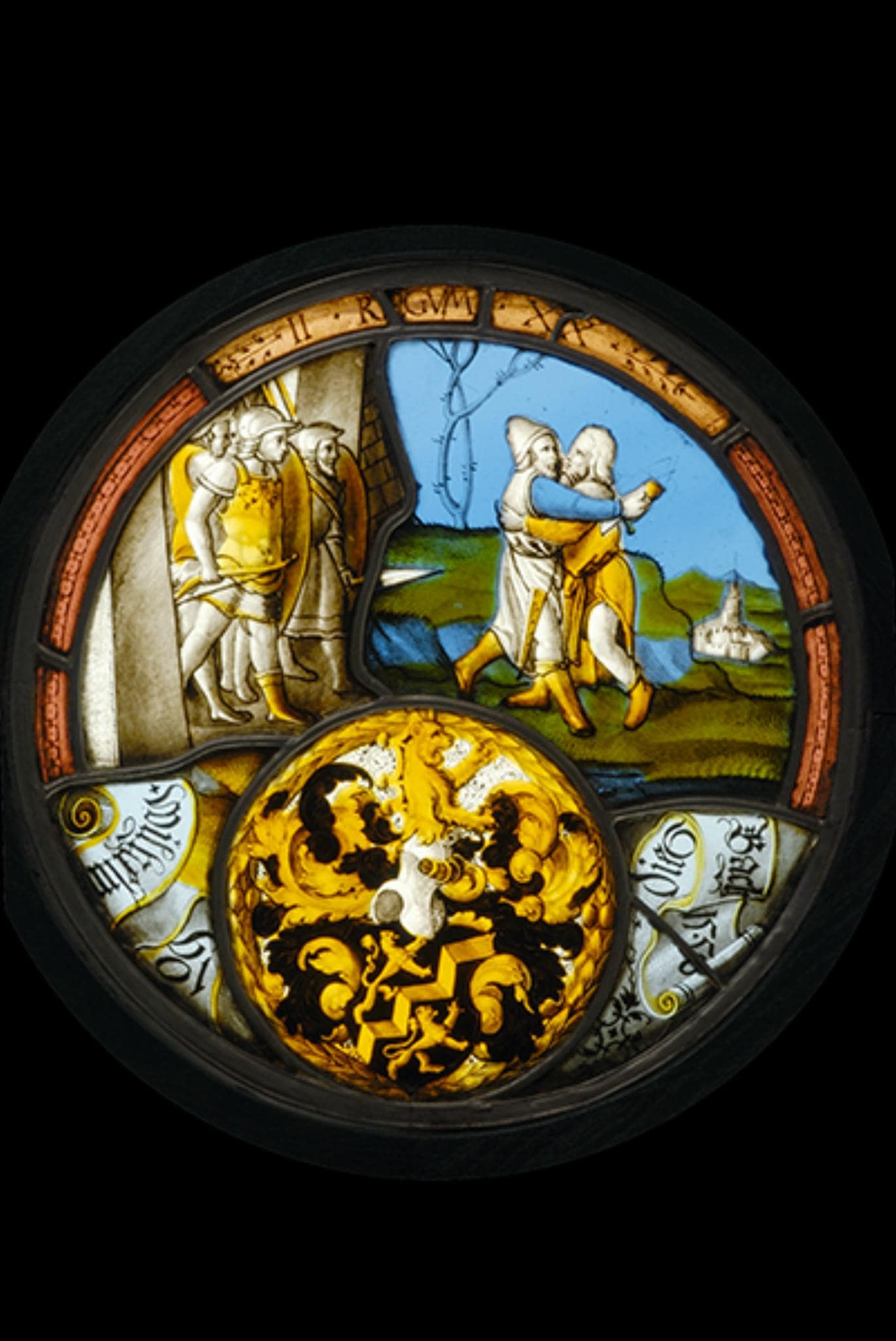 In der oberen Hälfte der Rundscheibe ist die Ermordung Amasas durch Joab festgehalten (2 Sam 20). Die rosa Ornamentbordüre schliesst am oberen Rand die Angabe der Bibelstelle ein (die hier der Biblia Vulgata folgend das 2. Buch der Könige anstelle desjenigen Samuels nennt). Die untere Hälfte füllt das umkränzte, von der Banderole mit dem Stifternamen umflatterte Vollwappen des Wilhelm von Diesbach.
