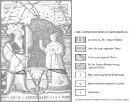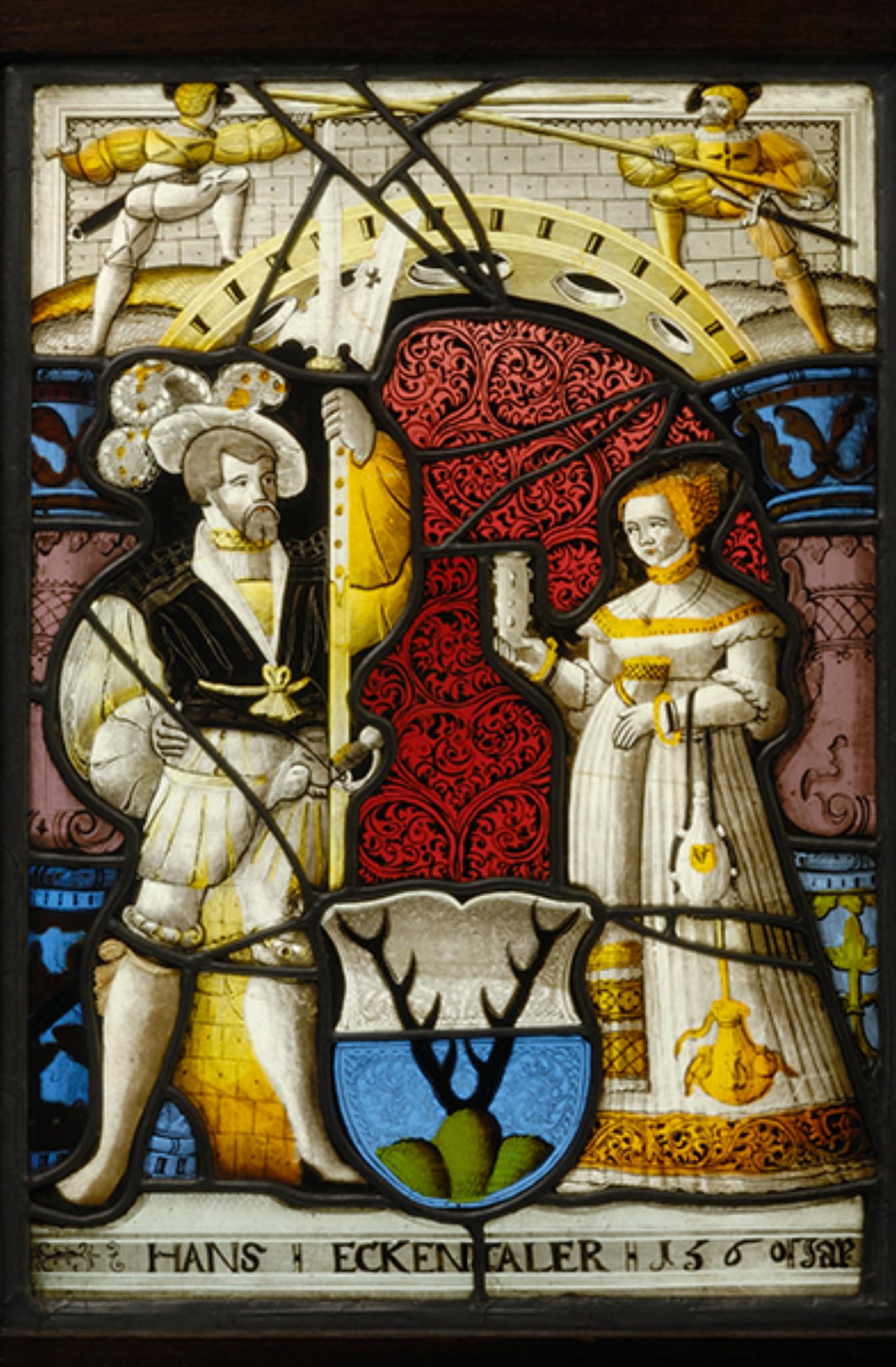Das vor roten Rankendamast gesetzte Wappen Hans Eckenthalers wird vom Stifterpaar flankiert. Dieses steht auf dem schmalen Podium mit dem Stifternamen. Der weisse Hosen und Strümpfe, ein kurzärmeliges schwarzes Wams sowie einen weissen Federhut tragende Mann hält in seiner Linken die Halbarte. Seine Frau in langem weissem Gewand und gelber Haube bietet ihm in ihrer Rechten den Willkommtrunk in einem Buckelbecher an. An ihrem Gürtel hängt der Beutel mit dem Essbesteck herab. Hinter den beiden Figuren erheben sich auf hohen blauen Basen lila Balustersäulen mit blauen Kapitellen. Diese verbindet ein gelber Flachbogen mit Oculi. Im Oberbild duellieren sich zwei Krieger, ein Landsknecht und ein Eidgenosse, mit langen Spiessen.