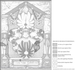 Vor blauem Damastgrund steht das Vollwappen der Familie von Hallwyl. Über seiner Helmzier ist am roten Giebel das Ordensemblem vom Fisch und Falken aufgehängt. Dieser Giebel fusst auf zwei Pfeilern mit hermenförmigen Karyatiden in Gestalt von Wildfrauen. Das Oberbild zeigt Reiter und Hund bei der Hirsch- und Eberjagd. Die Stifterinschrift befindet sich am büstengeschmuckten Podium.