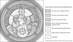 Die Aussenbordüre, die innere violette Bordüre (Kranz) sowie ein Stück im blauen Damast neu ergänzt; die Schwarzlotbemalung teilweise korrodiert; ein kleiner Sprung und Sprungbleie; die Verbleiung erneuert.