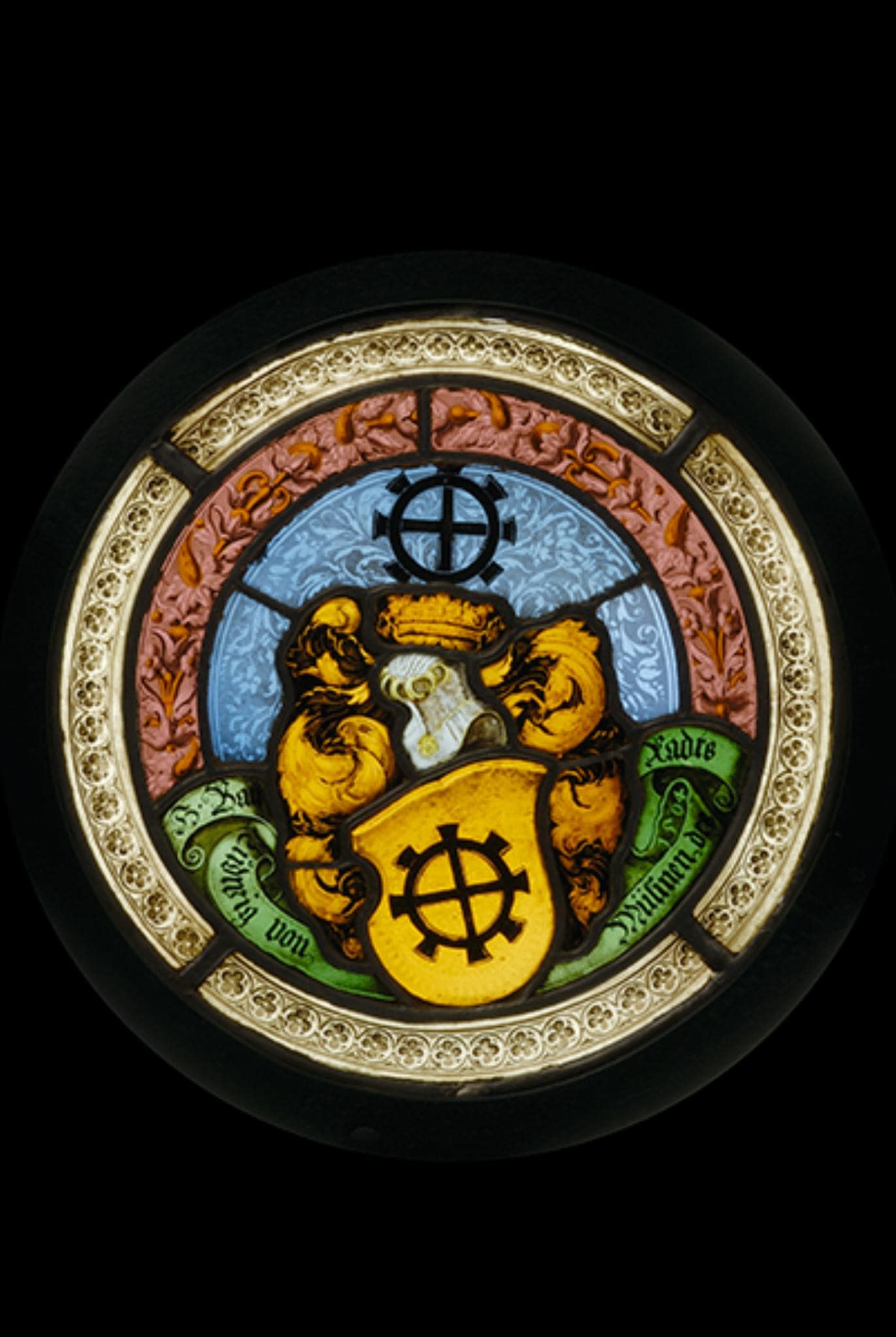 Farbiges Glas; Bemalung mit Schwarzlot und Silbergelb; rückseitig Brandmarken in Form eines Schleifchens.