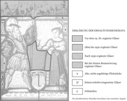 Das Oberbild und zwei Gläser im Zentrum neu ergänzt. Teile der Säulenrahmung und des Gebälks sind möglicherweise alte Flickstücke. Einige Sprünge und Sprungbleie; die Verbleiung erneuert.