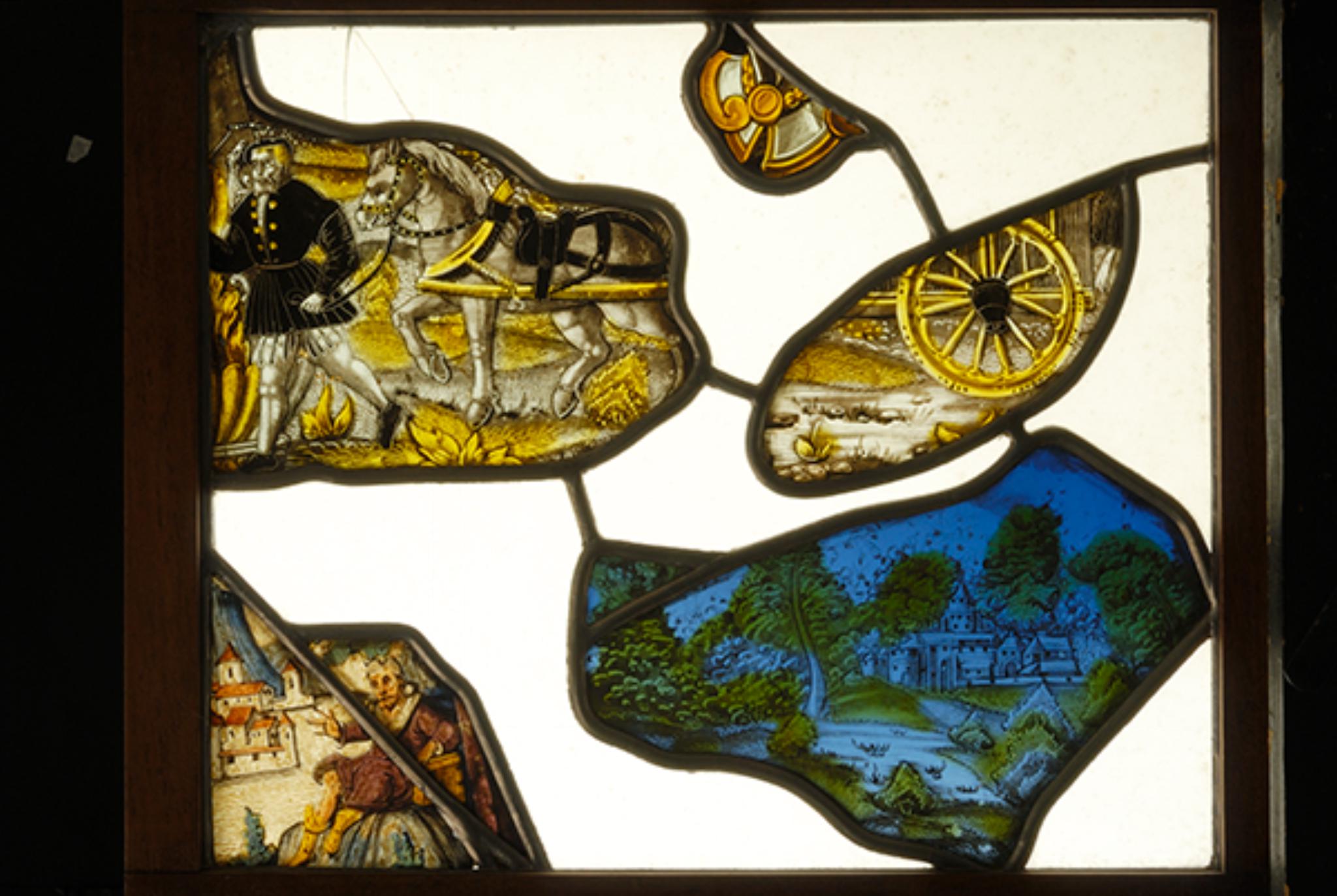 Die fünf in Blankglas gefassten Scheibenfragmente stammen aus unterschiedlichen Scheiben und stellen einen Bauern mit Pferdewagen (zwei Stücke), einen Landschaftshintergrund, ein Helmstück sowie einen thronenden Mann vor einer besiedelten Flusslandschaft dar.