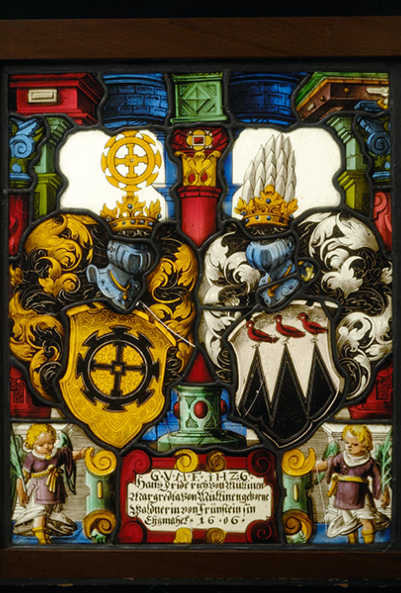 G.V.M.F. I.H.Z.G. / Hans Friderich von Müllinen / Margredta von Müllinen geborne / Waldnerin von Frünstein sin / Ehgemahel 1606.