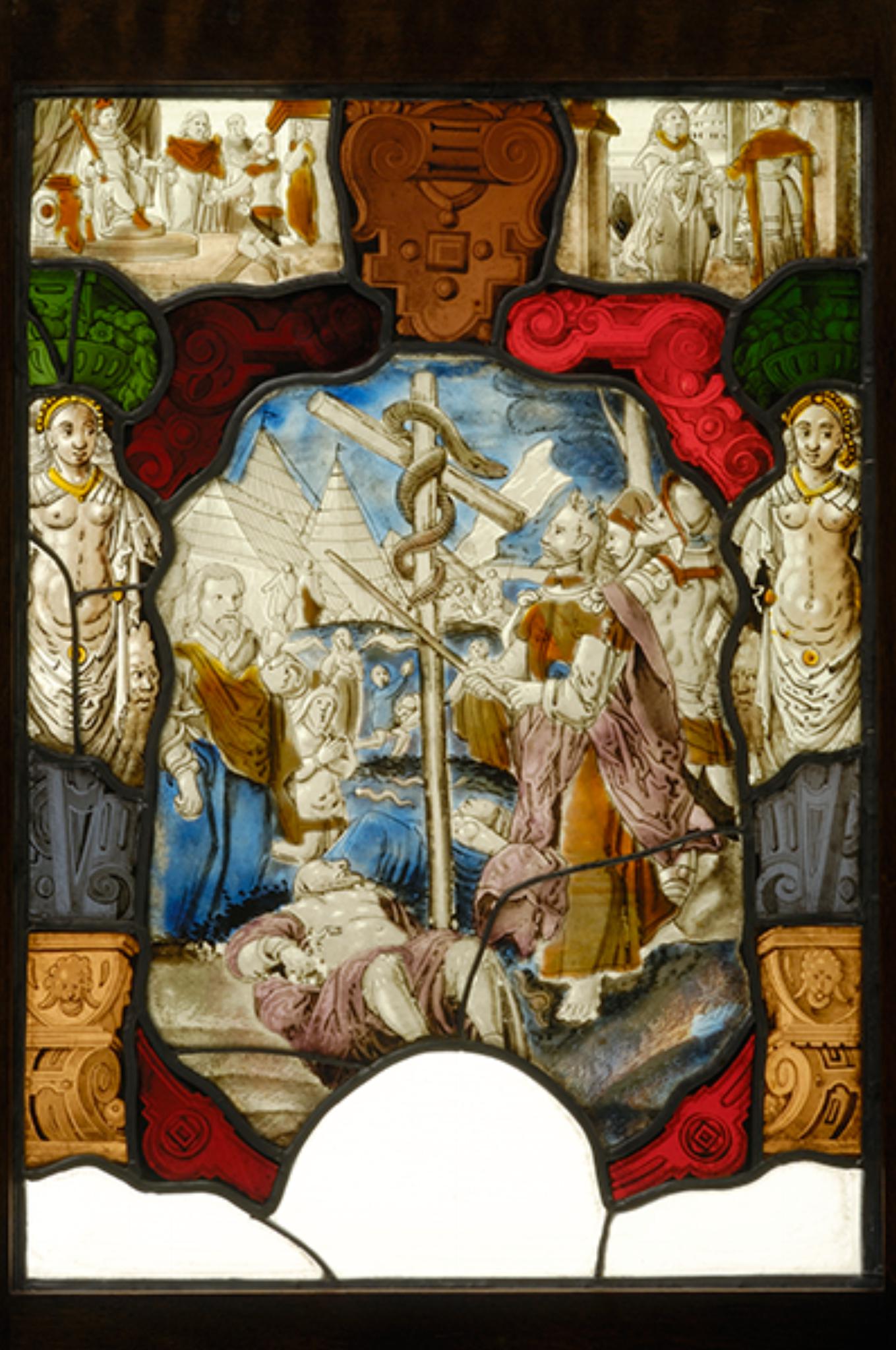 Im Hauptbild erscheint Moses, umringt von seinem Volk, vor der Ehernen Schlange. Davor ist in starker Verkürzung eine liegende männliche Figur festgehalten. Sie verkörpert die durch Gottes Strafe von Schlangen gebissenen Israeliten, die dank der von Moses erstellten ehernen Schlange am Leben blieben (Nm 21, 4–9). Die Darstellung umschliesst ein roter Rollwerkrahmen, dem seitlich hermenförmige Karyatiden vorgesetzt sind. Die beiden Figurenszenen im zweigeteilten Oberbild sind bislang ungedeutet. Die linke zeigt einen vor einem thronenden König und dessen Gefolge niederknienden Krieger (Ritter?), die rechte wiederum einen König, der einem Mönch begegnet. Wappen und Inschrift sind nicht mehr erhalten.