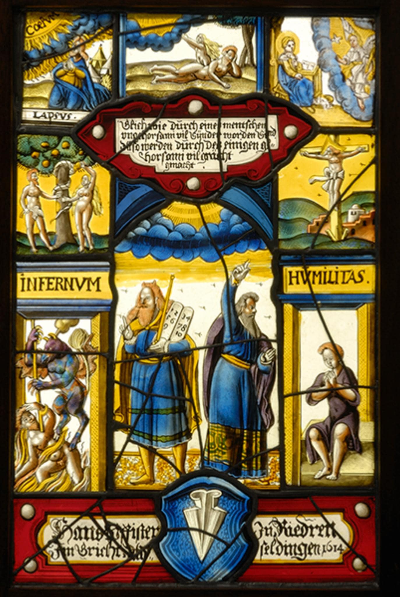 Das Glasgemälde thematisiert in mehreren Sinnbildern den Gehorsam und den Ungehorsam als Grundlage des rechtschaffenen ("Recht schaffenden") bzw. des sündhaften Lebensweges. Das hochrechteckige Mittelbild zeigt zwei voneinander abgewendete Gestalten, links Moses mit den zehn Geboten und rechts einen unbekannten Propheten (Aaron?). Um diese legen sich in Form eines Triumphbogens sieben kleinere Figurenszenen. Davon zeigt das zentrale Oberbild die Erschaffung Evas aus Adams Seite. Daran schliesst sich links eine Szene an, die einen in Gebetshaltung knienden Mann unter dem strahlenden Himmel ("Coelum") zeigt (Moses im Gebet). Darunter folgen Adam und Eva beim Sündenfall im Paradies, auf die sich offenbar der darüber stehende Bildtitel "Lapsus" (Fehler) bezieht, sowie unter der Bezeichnung "Infernum" ein Teufel, der eine verdammte Seele ins Höllenfeuer stösst. Auf der gegenüberliegenden Seite sind von oben nach unten die Verkündigung an Maria (ergänzt), Christus am Kreuz sowie eine mit gefalteten Händen sitzende Figur als Verkörperung der "Humilitas" (Gehorsam) dargestellt. Zur Erläuterung dient die Legende in der roten Rollwerkkartusche am blauen Bogen über den beiden Hauptgestalten. Die Sockelzone füllt die Tafel mit dem Namen des Stifters, dessen Wappen in deren Zentrum platziert ist.