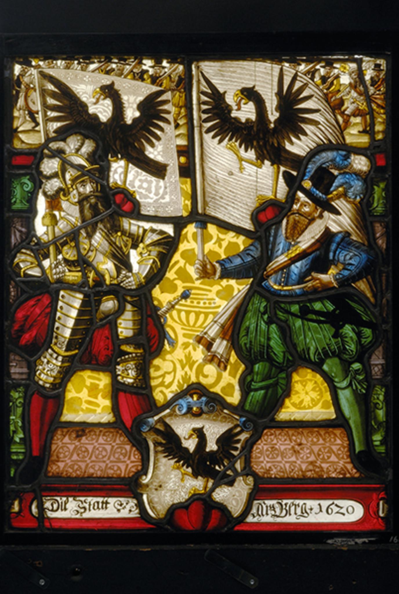 Das Stadtwappen Aarbergs ist vor das Podium gesetzt, an dessen Vorderseite in roter Rahmung der Stiftername festgehalten ist. Auf dem lila Fliesenboden des Podiums stehen zwei bärtige Bannerträger vor gelbem Damastgrund. Derjenige links im Halbharnisch und in roten Beinkleidern trägt das Banner der Stadt Aarberg. Er ist mit Schwert und Schweizerdolch bewaffnet. Sein Kollege in grünen Hosen und blauem Rock sowie mit Federhut und übergelegter Schärpe hält das Banner der Landvogtei bzw. des Amtes Aarberg, das zusätzlich zum Stadtadler auf rotem Dreiberg ein durchgehendes weisses Kreuz zeigt (Aarberg 1999, S. 191). Auf den hinter den beiden Schildwächtern kaum sichtbaren Rahmensäulen fusst ein flaches rotes Gebälk. Darüber erscheint im Oberbild ein Auszug von Aarberger Büchsenschützen in Begleitung eines Trommlers.