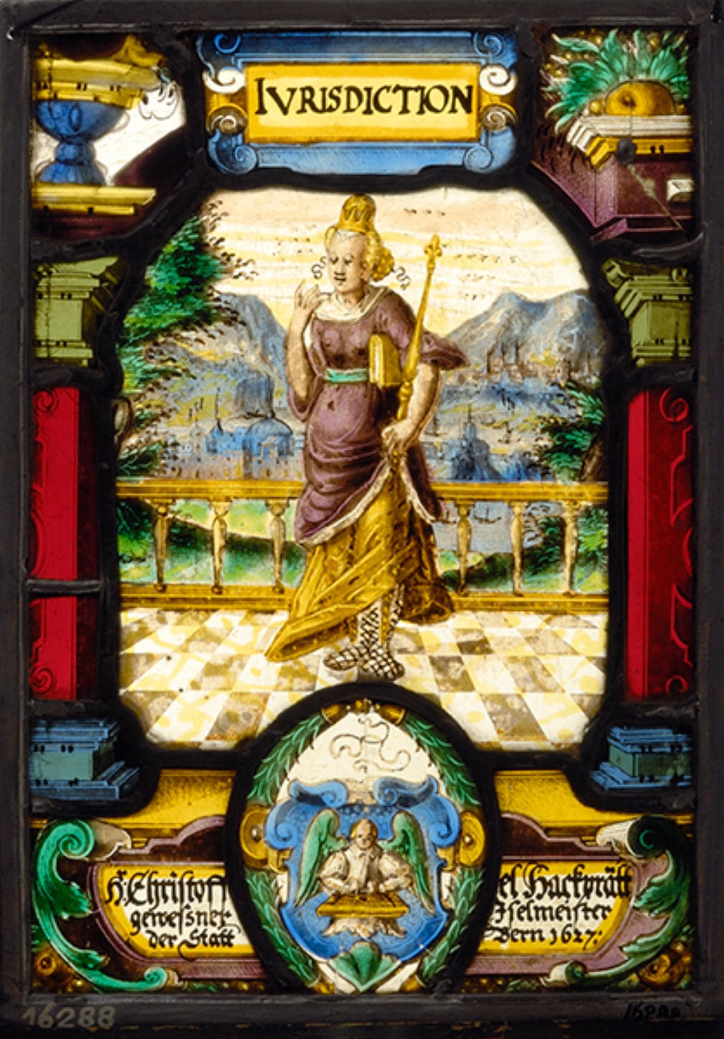 Die Jurisdiktion (Gerichtsbarkeit) verkörpert eine gekrönte Frauengestalt in violettem Ober- und langem gelbem Untergewand. Vor einer Balustrade auf Fliesenboden stehend, hält sie in ihrer linken Hand einen lilienbekrönten Gerichtsstab und unter dem Arm das geschlossene Gesetzbuch. Die architektonische Umrahmung bildet eine Arkade aus roten Pfeilern mit blauen Sockeln und grünen Kapitellen sowie einem violetten Flachbogen, dessen Scheitel eine blaue Rollwerkkartusche mit der Bezeichnung der Allegorie ziert. Am Scheibenfuss befindet sich vor dem Podium die Rolwerkkartusche mit dem Stifternamen und das Wappen Christoph Hackbretts in einem ovalen Lorbeerkranz.