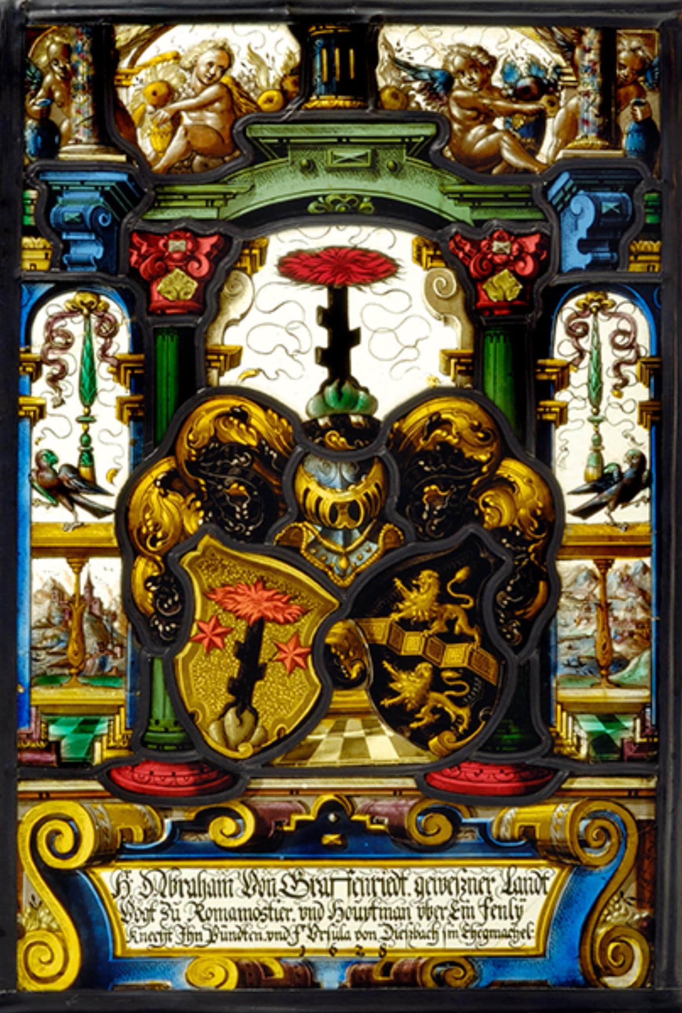 Beim vorliegenden, 1628 datierten Glasgemälde handelt es sich um eine Gedenkscheibe an den 1620 verstorbenen Abraham von Graffenried. In Auftrag gegeben wurde dieses entweder von dessen Gemahlin Ursula von Diesbach, die selbst 1628 verstarb, oder von einem der Söhne des Ehepaares.