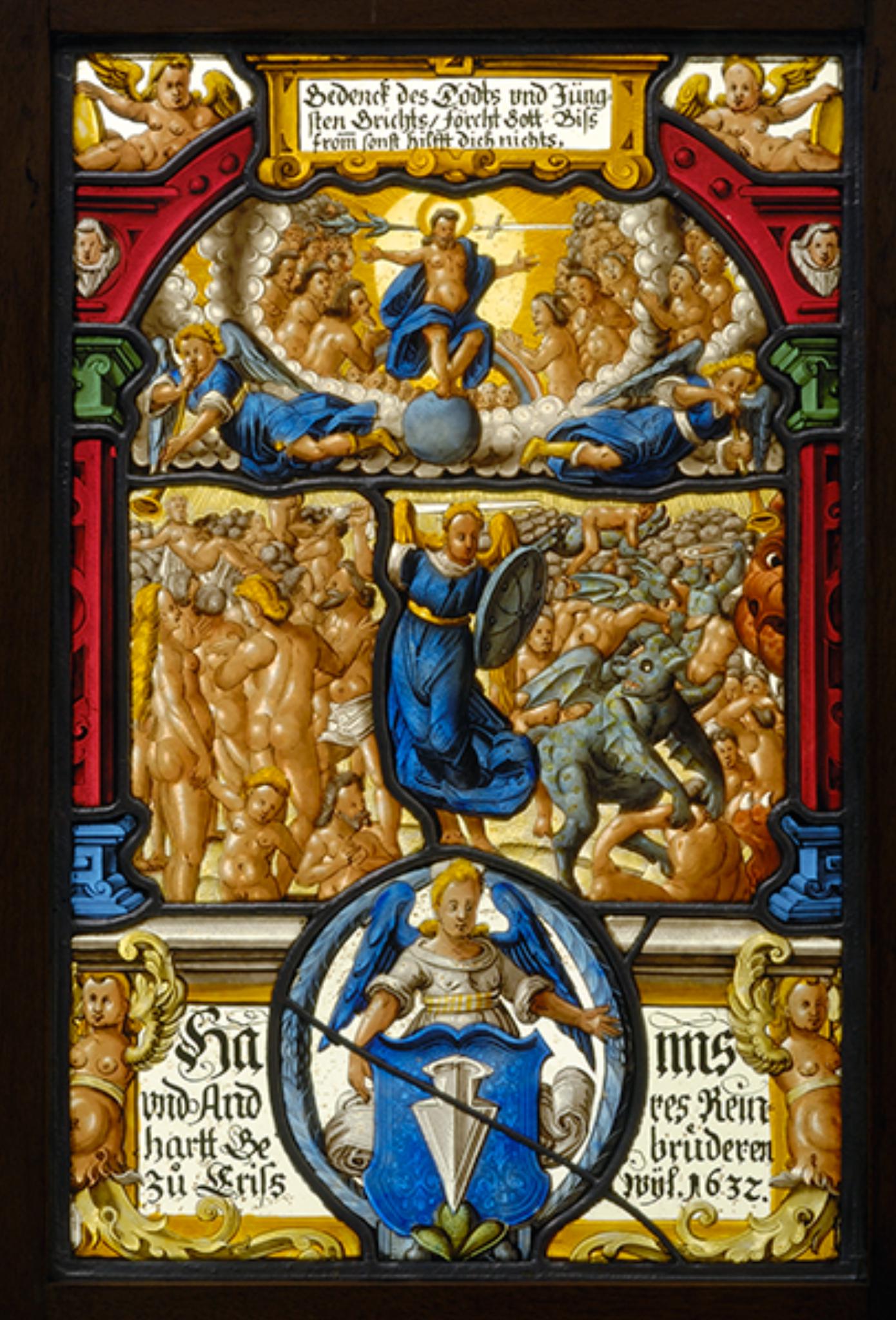 Das Zentrum zeigt die zweizonig komponierte Darstellung des Jüngsten Gerichts. Im unteren Teil trennt der blau gekleidete Erzengel Michael mit Richtschwert und Schild die guten von den sündigen Seelen, die von Teufeln in den Abgrund gestossen werden. Darüber erscheint, im Wolkenkranz von den Seligen umgeben, der thronende Christus als Weltenrichter in Begleitung zweier hornblasender Engel. Die Figurenszene umfasst eine rote Rahmenarkade mit einer die Bildlegende enthaltenden gelben Rollwerkkartusche am Scheitel. Daneben haben sich auf der Arkade zwei Putten mit Schilden niedergelassen. Im Zentrum des Scheibenfusses steht das in einem grünen Ovalkranz von einem Engel gehaltene Wappen der Brüder Hans und Andreas Reinhart (Reinhard). Es ist der mit zwei Hermenputten und mit Rollwerk verzierten Schrifttafel am Podium aufgesetzt.