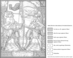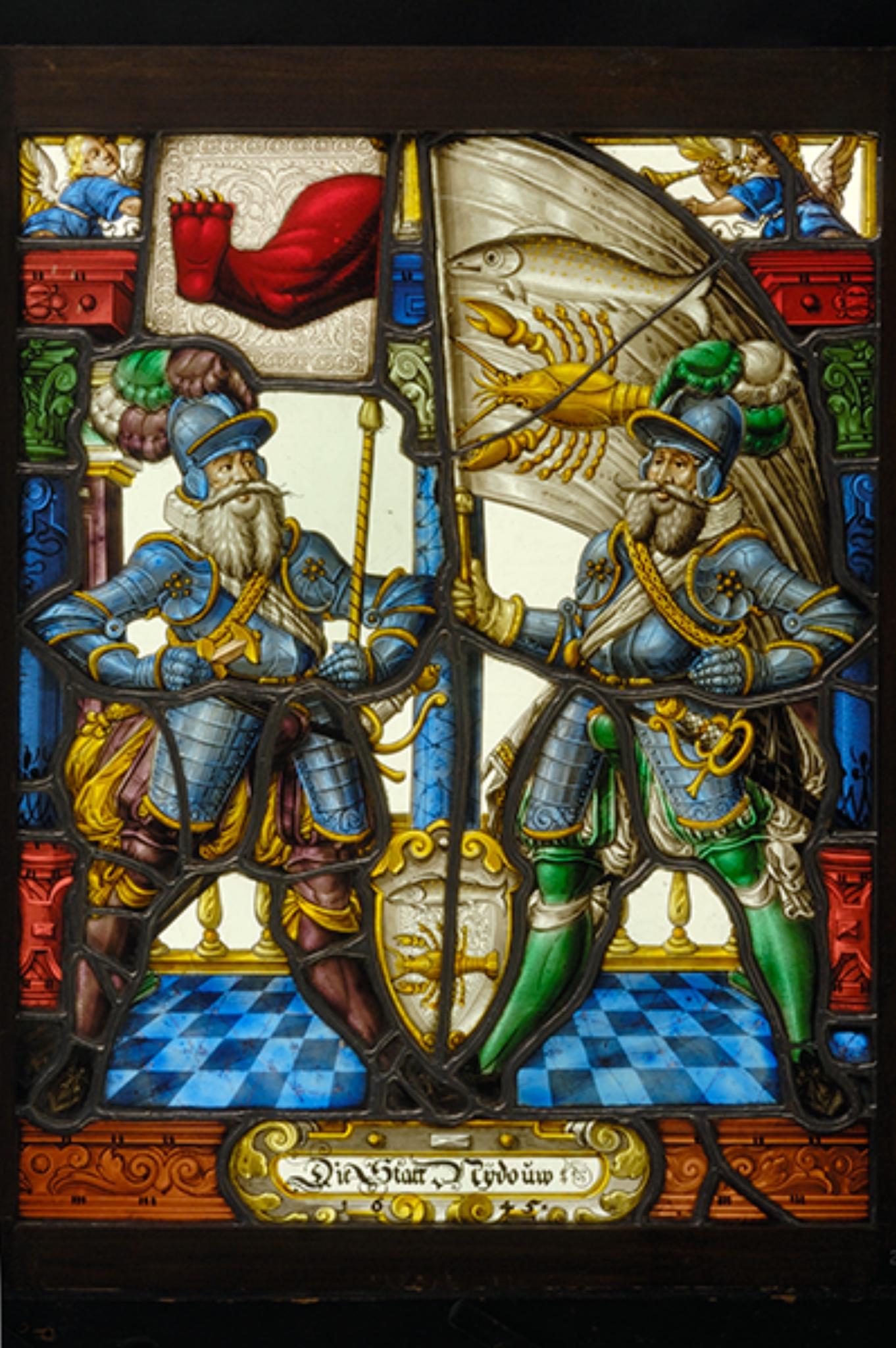 Die bärtigen Bannerträger von Amt und Stadt Nidau sind an den vorderen Rand des niederen Podiums gesetzt, dessen Vorderfront die gelbe Rollwerkkartusche mit dem Stifternamen ziert. Breitbeinig dastehend und mit dem Nidauer Stadtschild zwischen ihren Füssen, erscheinen beide schwertbewaffnet in einem stahlblauen Halbharnisch. Während der das Banner der Landvogtei Nidau mit der roten Bärentatze emporhebende Kriegsmann geschlitzte Pluderhosen in den Farben Violett und Gelb trägt, ist sein das Stadtbanner haltender Kollege in solche in den Farben Grün und Weiss gekleidet. Auf dem blau gefliesten Podium erheben sich als Seitenrahmung Doppelstützen aus Pfeilern und vorgelegten blauen Säulen mit roten Basen und grünen Kapitellen. Auf dem darauf ruhenden roten Gebälk ist je ein hornblasender Putto niedergelassen (zum Wappen von Stadt und Amt Nidau vgl. die Scheibe Nidaus von 1621 im BHM Bern, Inv. 20793).