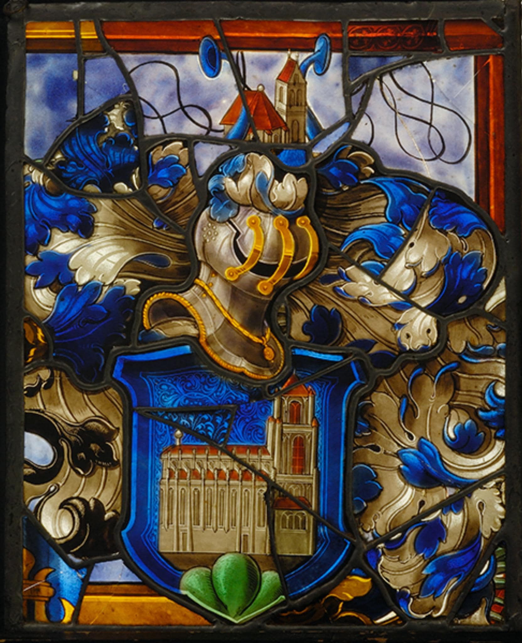 Die Scheibe ist neu zusammengesetzt, und zwar vorwiegend aus den Fragmenten einer Wappenscheibe Kirchberger. Darin integriert sind mehrere Flickstücke aus anderen Scheiben sowie auch Ergänzungen (u. a. im Wappen).