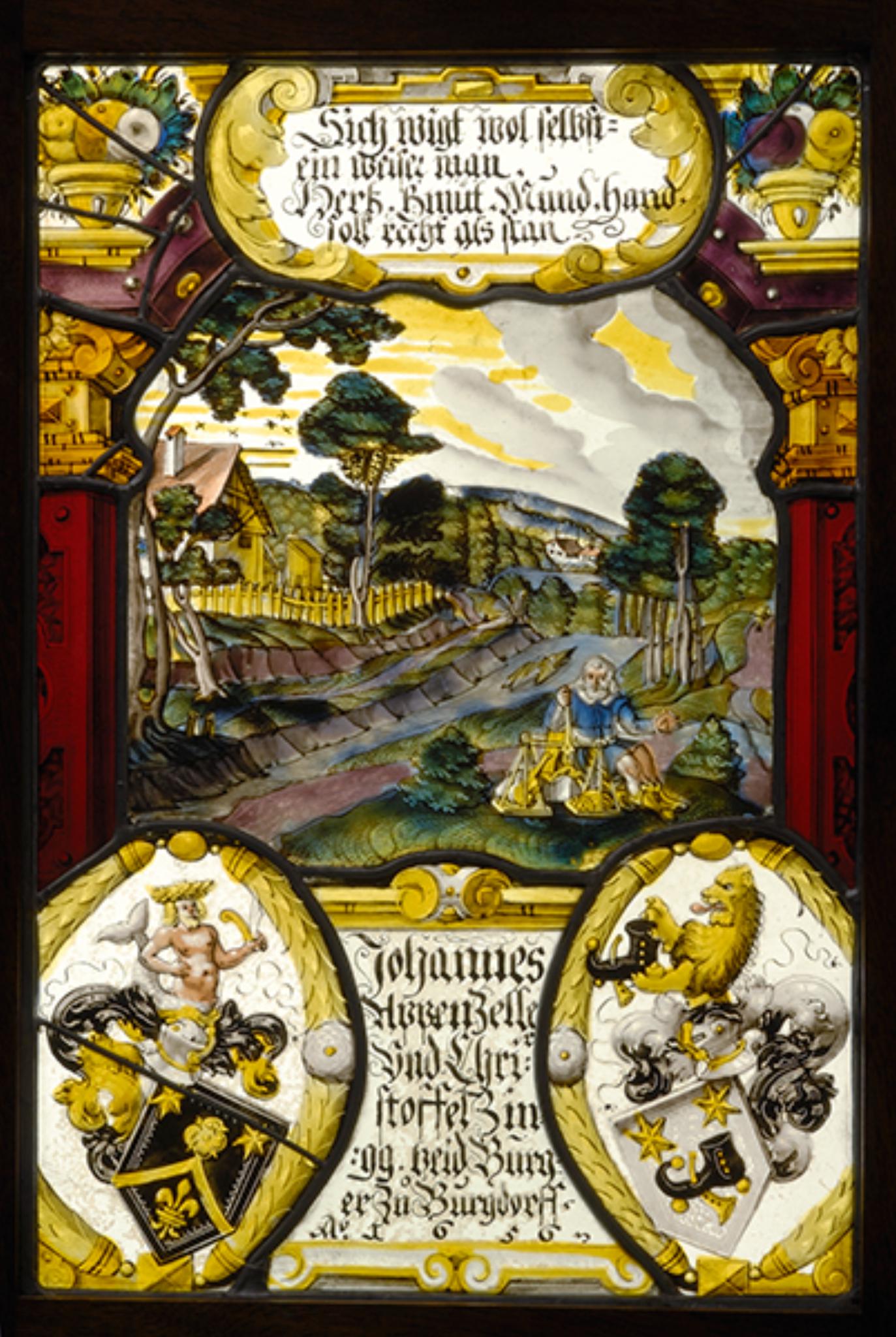 Als Vorlage zum Mittelbild der Scheibe diente eine Radierung Matthäus Merians des Älteren für die erste Blattfolge der "Novae regionum aliquot amaenissimarum delineationes", erschienen 1622/24 bei Peter Aubry in Strassburg (Wüthrich 1966, I, S. 116, Nr. 469, Abb. 249; Virtuelles Kupferstichkabinett). Sie symbolisiert den "vir bonus", den Ehrenmann, der sein Hab und Gut gegeneinander aufwiegt. Denn der weise Mann hält seine Waage im Gleichgewicht und lässt nicht zu, dass Habsucht, Begierde oder Ungerechtigkeit von seinem Herz Besitz ergreifen.