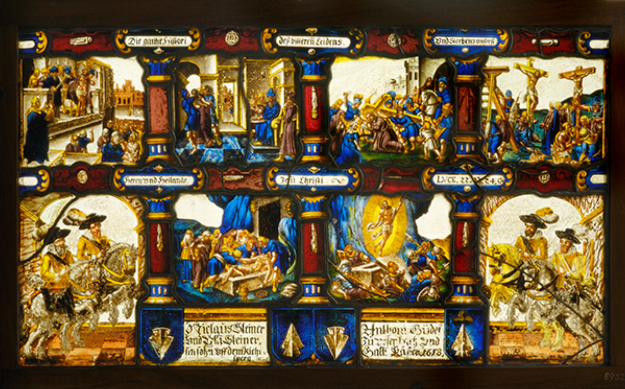 Die längsrechteckige Scheibe schildert in sechs zweireihig angelegten Bildfeldern die Passionsgeschichte Christi. In der oberen Reihe sind folgende vier Szenen dargestellt (von links nach rechts): Christus wird dem Volk vorgeführt (Ecce homo), Abführung Christi von dem sich die Hände waschenden Pilatus, Kreuztragung Christi sowie Golgatha mit Christus und den Schächern am Kreuz. Dazu gesellen sich in der unteren Reihe die Grablegung und die Auferstehung Christi. Diese sechs Passionsbilder gestaltete der unbekannte Glasmaler nach den entsprechenden Kupferstichen aus Matthäus Merians Bilderbibel (Illustrationen zu Joh. 19, 1–16; Matth. 27, 15–26; Luk. 23, 26–32; Matth. 27, 33–50; Matth. 27, 57–60; Matth. 28, 1–10). Unter den beiden letztgenannten Szenen befindet sich ein Sockelfeld mit den Wappen und den Namen der vier Stifter. Diese selbst erscheinen zu beiden Seiten davon je zu zweit in einer marmorierten Arkade als Reiter auf steigenden Pferden.