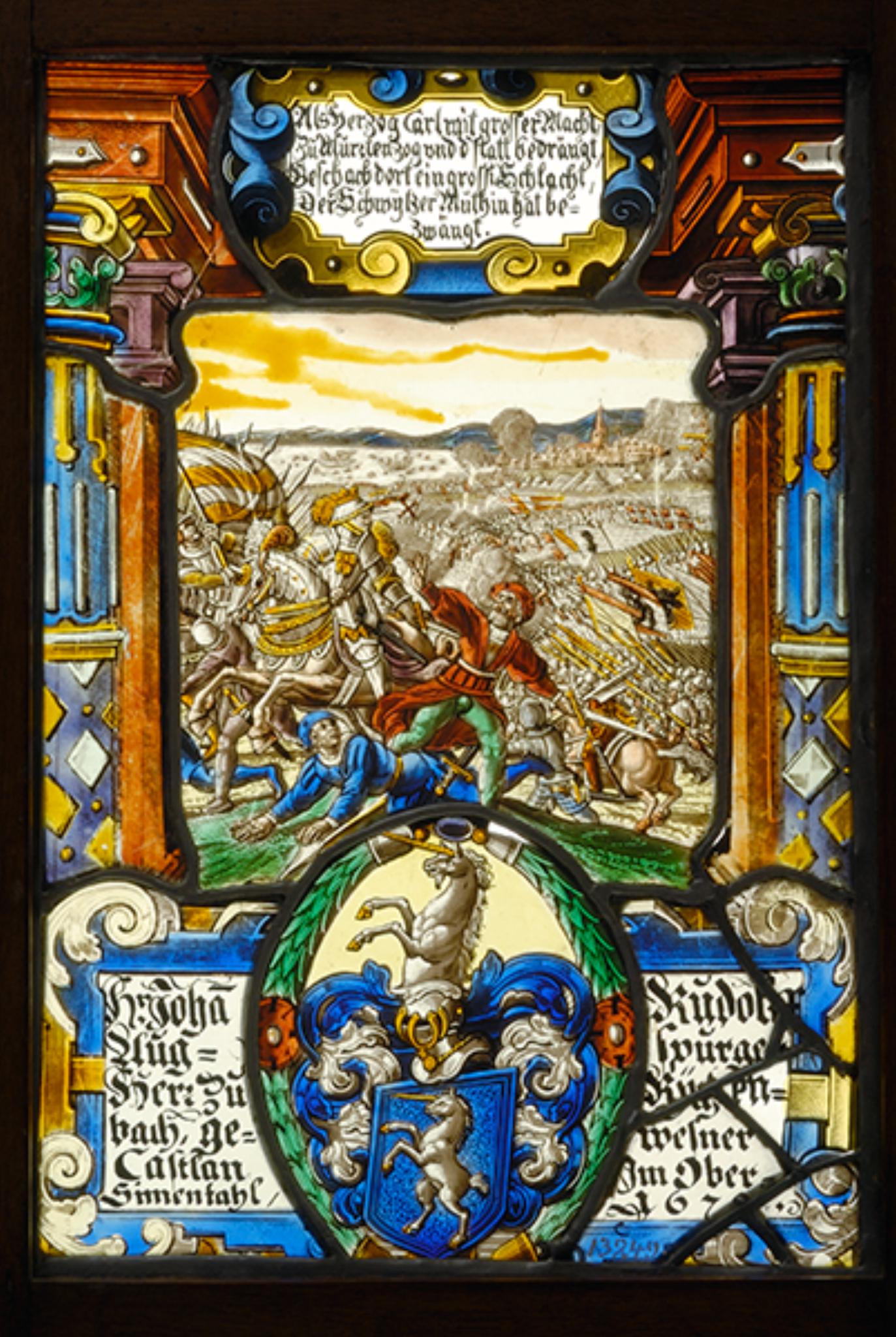 Als Herzog Carl mit grosser Macht, / zů Můrten zog vnd d'statt bedrängt, / Beschach dort ein grossi Schlacht, / Der Schwÿtzer Můth in hat be= / zwängt.